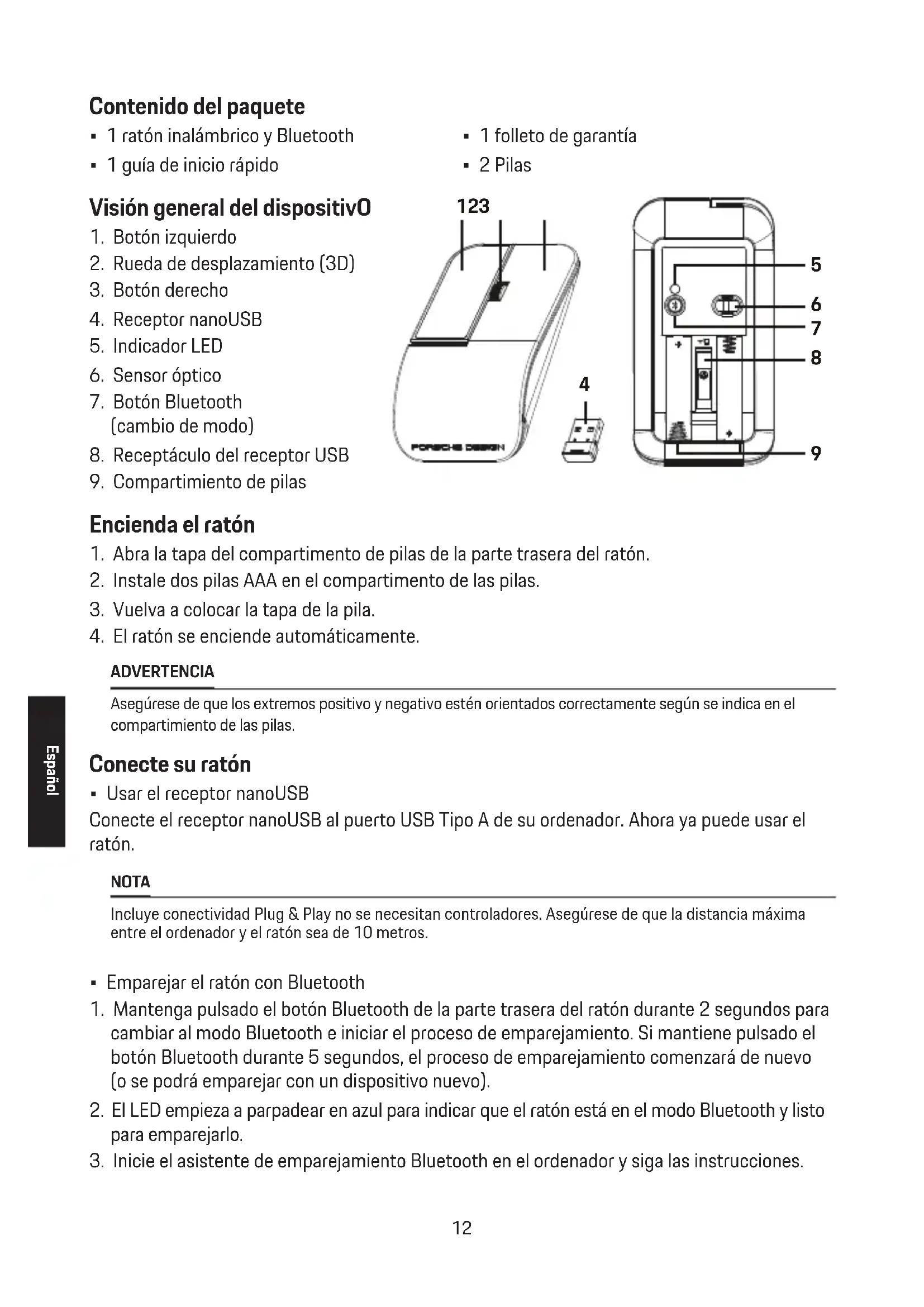 ADVERTENCIA Asegúrese de que los extremos positivo y negativo estén ubicados de forma correcta como muestra el compartimiento para baterías. Conectar el mouse