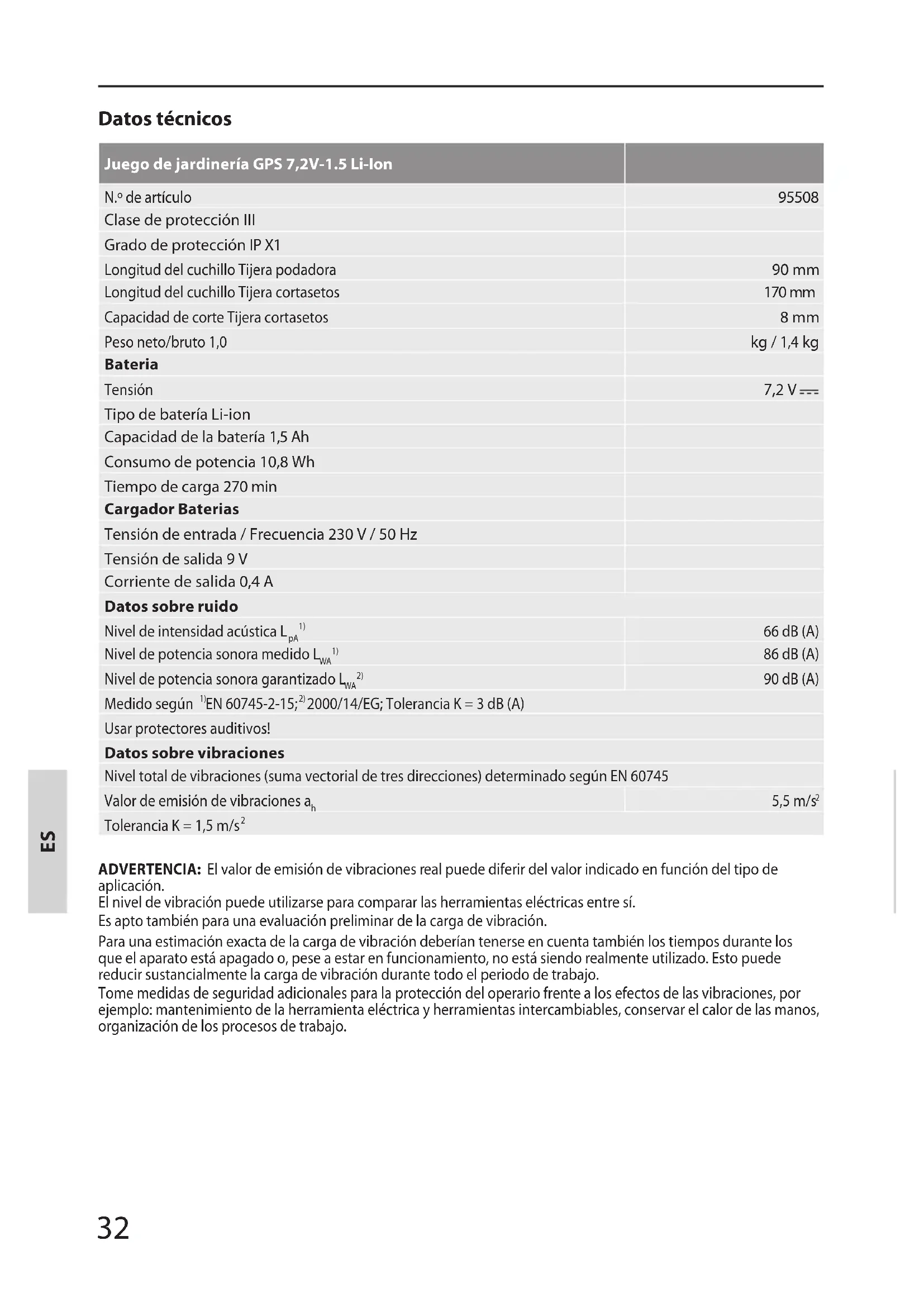 ADVERTENCIA: El valor de emisión de vibraciones real puede diferir del valor indicado en función del tipo de aplicación. El nivel de vibración puede utilizarse para comparar las herramientas eléctricas entre sí. Es apto también para una evaluación preliminar de la carga de vibración. Para una estimación exacta de la carga de vibración deberían tenerse en cuenta también los tiempos durante los que el aparato está apagado o, pese a estar en funcionamiento, no está siendo realmente utilizado. Esto puede reducir sustancialmente la carga de vibración durante todo el periodo de trabajo. Tome medidas de seguridad adicionales para la protección del operario frente a los efectos de las vibraciones, por ejemplo: mantenimiento de la herramienta eléctrica y herramientas intercambiables, conservar el calor de las manos, organización de los procesos de trabajo. ES33