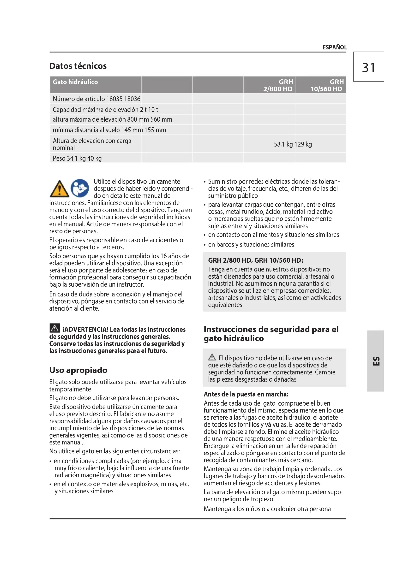 ESPAÑOL Datos técnicos Gato hidráulico GRH 2/800 HD GRH 10/560 HD Número de artículo 18035 18036 Capacidad máxima de elevación 2 t 10 t altura máxima de elevación 800 mm 560 mm mínima distancia al suelo 145 mm 155 mm Altura de elevación con carga nominal 58,1 kg 129 kg Peso 34,1 kg 40 kg Utilice el dispositivo únicamente después de haber leído y comprendi- do en detalle este manual de instrucciones. Familiarícese con los elementos de mando y con el uso correcto del dispositivo. Tenga en cuenta todas las instrucciones de seguridad incluidas en el manual. Actúe de manera responsable con el resto de personas. El operario es responsable en caso de accidentes o peligros respecto a terceros. Solo personas que ya hayan cumplido los 16 años de edad pueden utilizar el dispositivo. Una excepción será el uso por parte de adolescentes en caso de formación profesional para conseguir su capacitación bajo la supervisión de un instructor. En caso de duda sobre la conexión y el manejo del dispositivo, póngase en contacto con el servicio de atención al cliente. ¡ADVERTENCIA! Lea todas las instrucciones de seguridad y las instrucciones generales. Conserve todas las instrucciones de seguridad y las instrucciones generales para el futuro. Uso apropiado El gato solo puede utilizarse para levantar vehículos temporalmente. El gato no debe utilizarse para levantar personas. Este dispositivo debe utilizarse únicamente para el uso previsto descrito. El fabricante no asume responsabilidad alguna por daños causados por el incumplimiento de las disposiciones de las normas generales vigentes, así como de las disposiciones de este manual. No utilice el gato en las siguientes circunstancias: