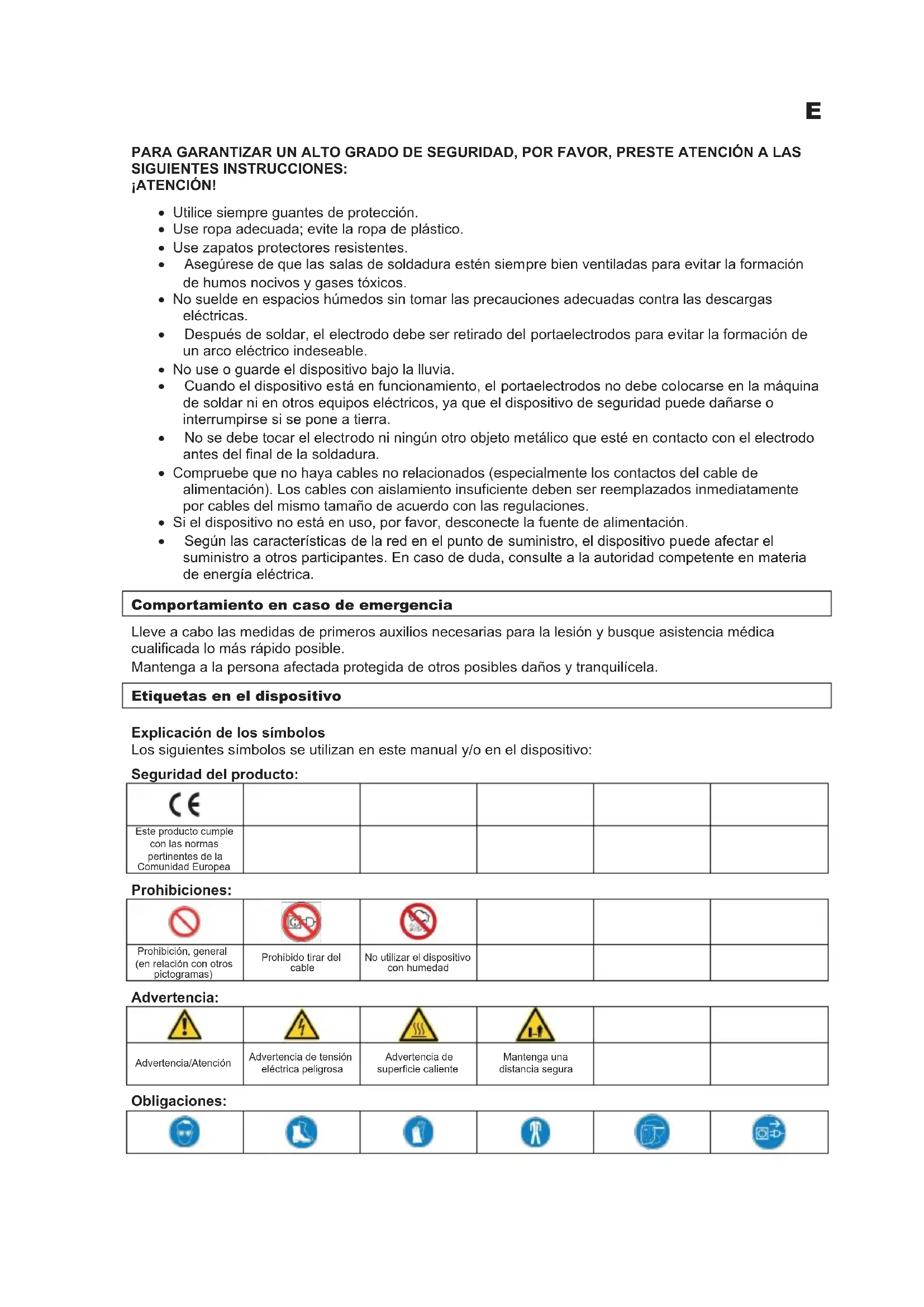 3$5$*$5$17,=$581$/72*5$'2'(6(*85,'$'325)$92535(67($7(1&,Ï1$/$6 6,*8,(17(6,16758&&,21(6 £$7(1&,Ï1 x Utilice siempre guantes de protección. x Use ropa adecuada; evite la ropa de plástico. x Use zapatos protectores resistentes. x Asegúrese de que las salas de soldadura estén siempre bien ventiladas para evitar la formación de humos nocivos y gases tóxicos. x No suelde en espacios húmedos sin tomar las precauciones adecuadas contra las descargas eléctricas. x Después de soldar, el electrodo debe ser retirado del portaelectrodos para evitar la formación de un arco eléctrico indeseable. x No use o guarde el dispositivo bajo la lluvia. x Cuando el dispositivo está en funcionamiento, el portaelectrodos no debe colocarse en la máquina de soldar ni en otros equipos eléctricos, ya que el dispositivo de seguridad puede dañarse o interrumpirse si se pone a tierra. x No se debe tocar el electrodo ni ningún otro objeto metálico que esté en contacto con el electrodo antes del final de la soldadura. x Compruebe que no haya cables no relacionados (especialmente los contactos del cable de alimentación). Los cables con aislamiento insuficiente deben ser reemplazados inmediatamente por cables del mismo tamaño de acuerdo con las regulaciones. x Si el dispositivo no está en uso, por favor, desconecte la fuente de alimentación. x Según las características de la red en el punto de suministro, el dispositivo puede afectar el suministro a otros participantes. En caso de duda, consulte a la autoridad competente en materia de energía eléctrica. Comportamiento en caso de emergencia Lleve a cabo las medidas de primeros auxilios necesarias para la lesión y busque asistencia médica cualificada lo más rápido posible. Mantenga a la persona afectada protegida de otros posibles daños y tranquilícela. Etiquetas en el dispositivo Explicación de los símbolos Los siguientes símbolos se utilizan en este manual y/o en el dispositivo: 6HJXULGDGGHOSURGXFWR