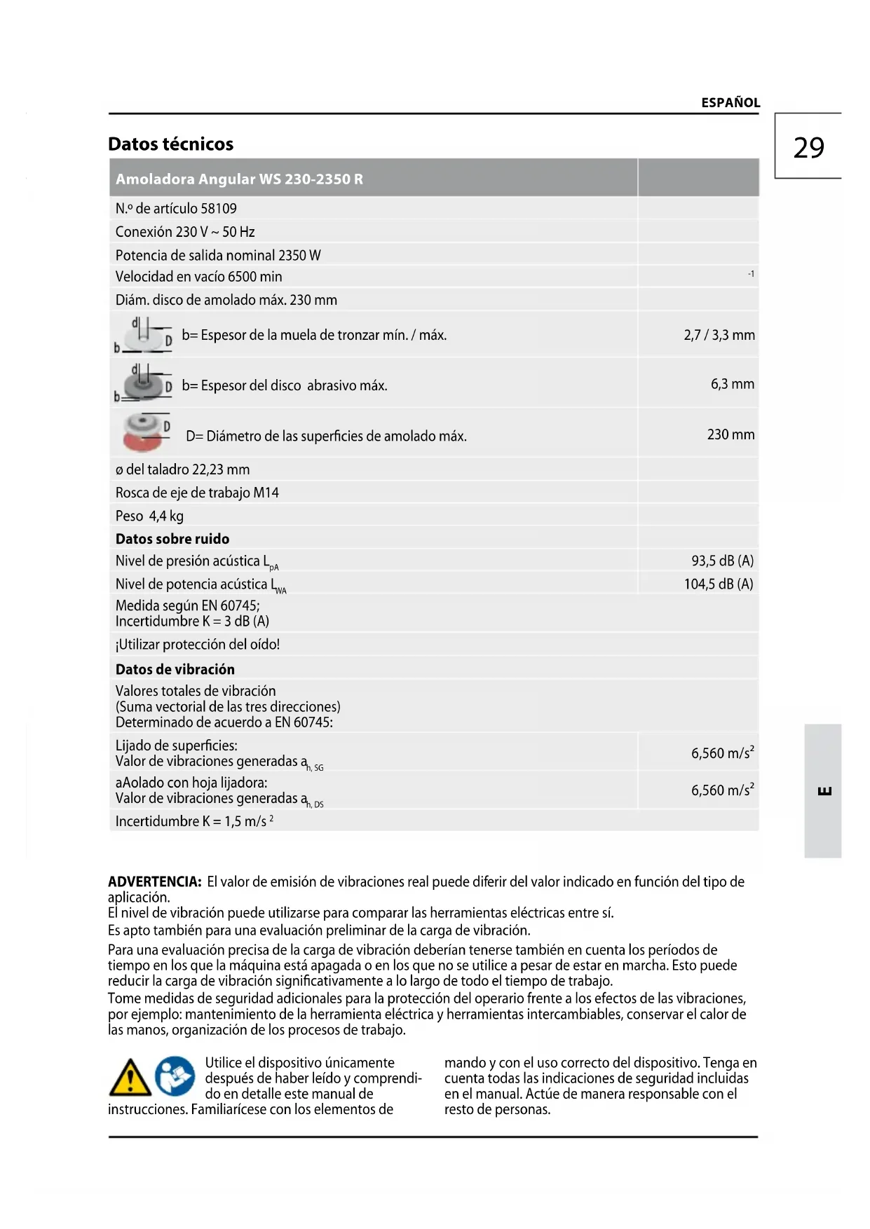 ESPAÑOL Datos técnicos Amoladora Angular WS 230-2350 R N.º de artículo 58109 Conexión 230 V ~ 50 Hz Potencia de salida nominal 2350 W Velocidad en vacío 6500 min