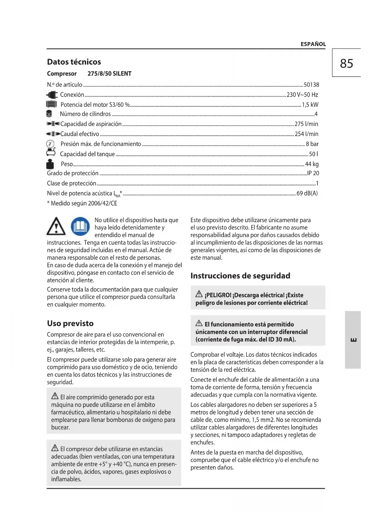 - Medido según 2006/42/CE No utilice el dispositivo hasta que haya leído detenidamente y entendido el manual de instrucciones. Tenga en cuenta todas las instruccio- nes de seguridad incluidas en el manual. Actúe de manera responsable con el resto de personas. En caso de duda acerca de la conexión y el manejo del dispositivo, póngase en contacto con el servicio de atención al cliente. Conserve toda la documentación para que cualquier persona que utilice el compresor pueda consultarla en cualquier momento. Uso previsto Compresor de aire para el uso convencional en estancias de interior protegidas de la intemperie, p. ej., garajes, talleres, etc. El compresor puede utilizarse solo para generar aire comprimido para uso doméstico y de ocio, teniendo en cuenta los datos técnicos y las instrucciones de seguridad. El aire comprimido generado por esta máquina no puede utilizarse en el ámbito farmacéutico, alimentario u hospitalario ni debe emplearse para llenar bombonas de oxígeno para bucear. El compresor debe utilizarse en estancias adecuadas (bien ventiladas, con una temperatura ambiente de entre +5° y +40°C), nunca en presen- cia de polvo, ácidos, vapores, gases explosivos o inamables. Este dispositivo debe utilizarse únicamente para el uso previsto descrito. El fabricante no asume responsabilidad alguna por daños causados debido al incumplimiento de las disposiciones de las normas generales vigentes, así como de las disposiciones de este manual. Instrucciones de seguridad ¡PELIGRO! ¡Descarga eléctrica! ¡Existe peligro de lesiones por corriente eléctrica! El funcionamiento está permitido únicamente con un interruptor diferencial (corriente de fuga máx. del ID 30 mA). Comprobar el voltaje. Los datos técnicos indicados en la placa de características deben corresponder a la tensión de la red eléctrica. Conecte el enchufe del cable de alimentación a una toma de corriente de forma, tensión y frecuencia adecuadas y que cumpla con la normativa vigente. Los cables alargadores no deben ser superiores a 5 metros de longitud y deben tener una sección de cable de, como mínimo, 1,5 mm2. No se recomienda utilizar cables alargadores de diferentes longitudes y secciones, ni tampoco adaptadores y regletas de enchufes. Antes de la puesta en marcha del dispositivo, compruebe que el cable eléctrico y/o el enchufe no presenten daños. Datos técnicos Compresor 275/8/50 SILENT86 Mantenga siempre una distancia de seguridad de al menos 4 metros entre el compresor y el área de trabajo. ¡Atención! ¡La manguera de aire comprimido puede dar un latigazo al abrir el acoplamiento rápido! Sujete rmemente la manguera de aire comprimido. Transporte el compresor siempre por el asa. La utilización de aire comprimido para los distintos nes previstos (inado, herramientas neumáticas, pin