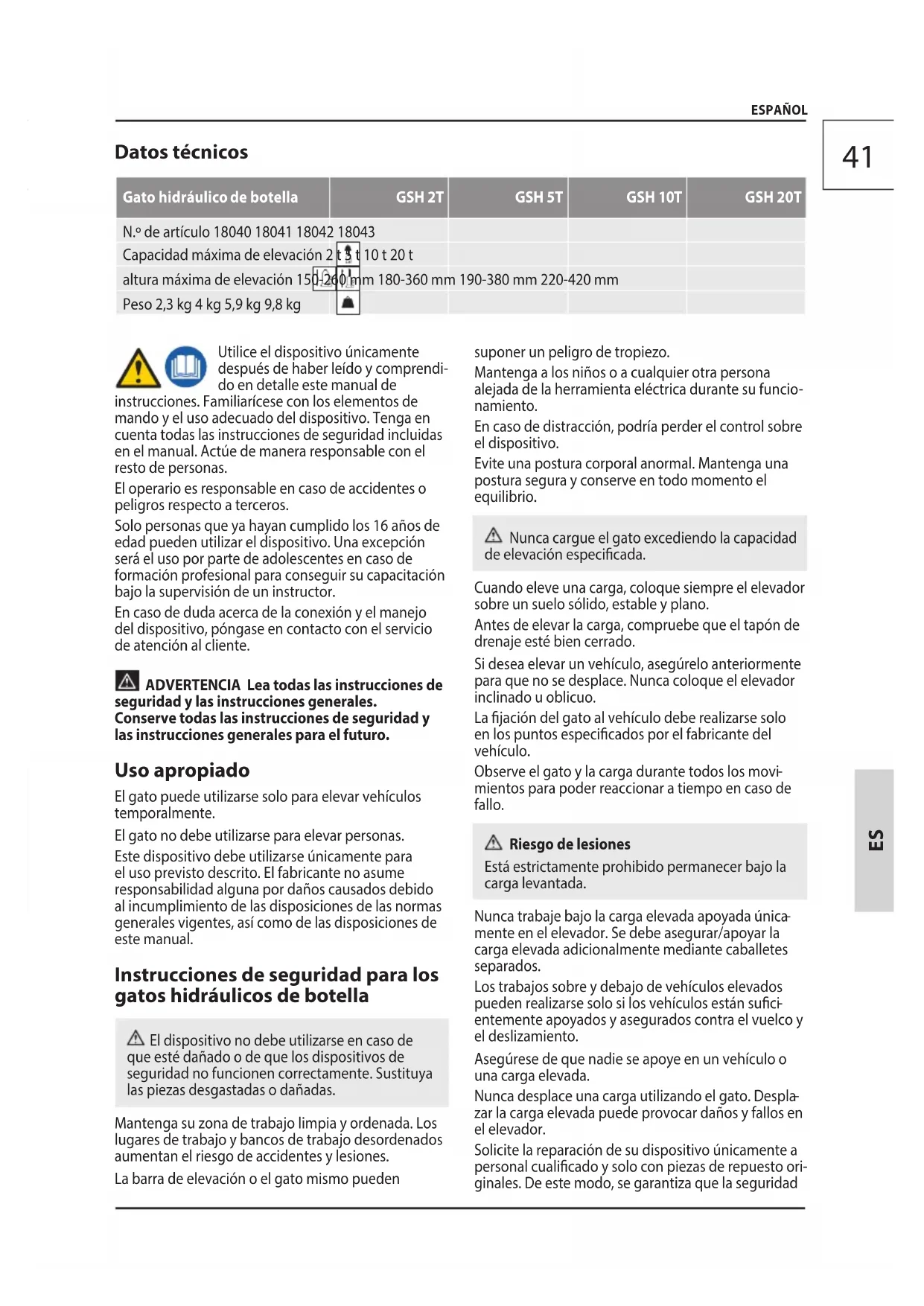 ESPAÑOL Datos técnicos Gato hidráulico de botella GSH 2T GSH 5T GSH 10T GSH 20T N.º de artículo 18040 18041 18042 18043 Capacidad máxima de elevación 2 t 5 t 10 t 20 t altura máxima de elevación 150-260 mm 180-360 mm 190-380 mm 220-420 mm Peso 2,3 kg 4 kg 5,9 kg 9,8 kg Utilice el dispositivo únicamente después de haber leído y comprendi- do en detalle este manual de instrucciones. Familiarícese con los elementos de mando y el uso adecuado del dispositivo. Tenga en cuenta todas las instrucciones de seguridad incluidas en el manual. Actúe de manera responsable con el resto de personas. El operario es responsable en caso de accidentes o peligros respecto a terceros. Solo personas que ya hayan cumplido los 16 años de edad pueden utilizar el dispositivo. Una excepción será el uso por parte de adolescentes en caso de formación profesional para conseguir su capacitación bajo la supervisión de un instructor. En caso de duda acerca de la conexión y el manejo del dispositivo, póngase en contacto con el servicio de atención al cliente. ADVERTENCIA Lea todas las instrucciones de seguridad y las instrucciones generales. Conserve todas las instrucciones de seguridad y las instrucciones generales para el futuro. Uso apropiado El gato puede utilizarse solo para elevar vehículos temporalmente. El gato no debe utilizarse para elevar personas. Este dispositivo debe utilizarse únicamente para el uso previsto descrito. El fabricante no asume responsabilidad alguna por daños causados debido al incumplimiento de las disposiciones de las normas generales vigentes, así como de las disposiciones de este manual. Instrucciones de seguridad para los gatos hidráulicos de botella El dispositivo no debe utilizarse en caso de que esté dañado o de que los dispositivos de seguridad no funcionen correctamente. Sustituya las piezas desgastadas o dañadas. Mantenga su zona de trabajo limpia y ordenada. Los lugares de trabajo y bancos de trabajo desordenados aumentan el riesgo de accidentes y lesiones. La barra de elevación o el gato mismo pueden suponer un peligro de tropiezo. Mantenga a los niños o a cualquier otra persona alejada de la herramienta eléctrica durante su funcio