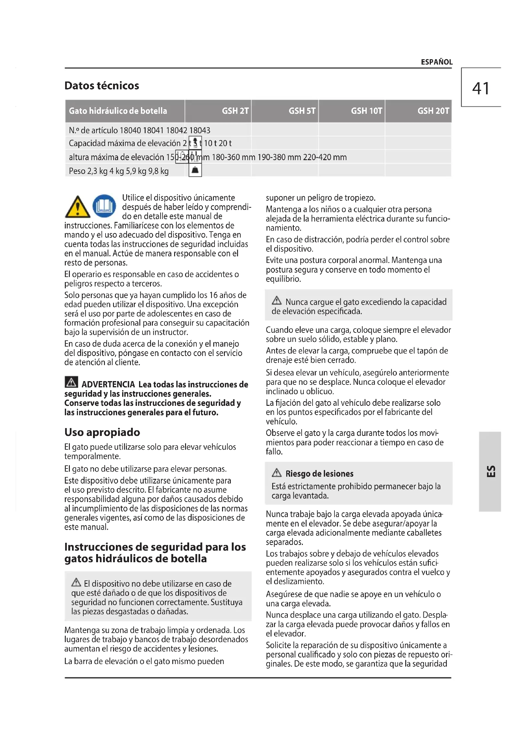 ESPAÑOL Datos técnicos Gato hidráulico de botella GSH 2T GSH 5T GSH 10T GSH 20T N.º de artículo 18040 18041 18042 18043 Capacidad máxima de elevación 2 t 5 t 10 t 20 t altura máxima de elevación 150-260 mm 180-360 mm 190-380 mm 220-420 mm Peso 2,3 kg 4 kg 5,9 kg 9,8 kg Utilice el dispositivo únicamente después de haber leído y comprendi- do en detalle este manual de instrucciones. Familiarícese con los elementos de mando y el uso adecuado del dispositivo. Tenga en cuenta todas las instrucciones de seguridad incluidas en el manual. Actúe de manera responsable con el resto de personas. El operario es responsable en caso de accidentes o peligros respecto a terceros. Solo personas que ya hayan cumplido los 16 años de edad pueden utilizar el dispositivo. Una excepción será el uso por parte de adolescentes en caso de formación profesional para conseguir su capacitación bajo la supervisión de un instructor. En caso de duda acerca de la conexión y el manejo del dispositivo, póngase en contacto con el servicio de atención al cliente. ADVERTENCIA Lea todas las instrucciones de seguridad y las instrucciones generales. Conserve todas las instrucciones de seguridad y las instrucciones generales para el futuro. Uso apropiado El gato puede utilizarse solo para elevar vehículos temporalmente. El gato no debe utilizarse para elevar personas. Este dispositivo debe utilizarse únicamente para el uso previsto descrito. El fabricante no asume responsabilidad alguna por daños causados debido al incumplimiento de las disposiciones de las normas generales vigentes, así como de las disposiciones de este manual. Instrucciones de seguridad para los gatos hidráulicos de botella El dispositivo no debe utilizarse en caso de que esté dañado o de que los dispositivos de seguridad no funcionen correctamente. Sustituya las piezas desgastadas o dañadas. Mantenga su zona de trabajo limpia y ordenada. Los lugares de trabajo y bancos de trabajo desordenados aumentan el riesgo de accidentes y lesiones. La barra de elevación o el gato mismo pueden suponer un peligro de tropiezo. Mantenga a los niños o a cualquier otra persona alejada de la herramienta eléctrica durante su funcio