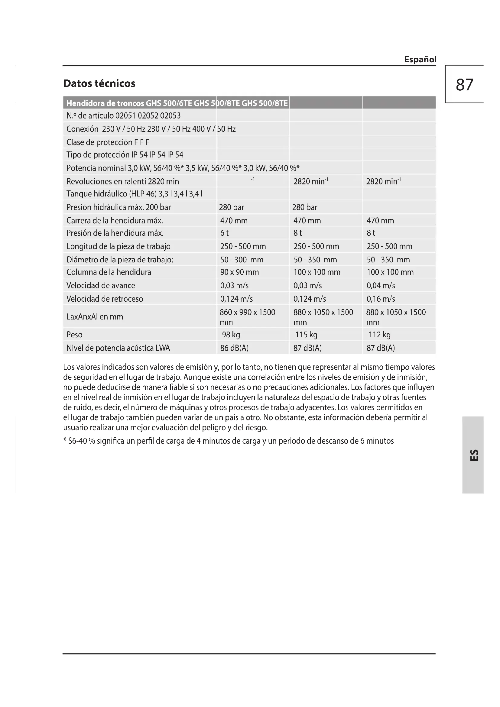 Español Datos técnicos Hendidora de troncos GHS 500/6TE GHS 500/8TE GHS 500/8TE N.º de artículo 02051 02052 02053 Conexión 230 V / 50 Hz 230 V / 50 Hz 400 V / 50 Hz Clase de protección F F F Tipo de protección IP 54 IP 54 IP 54 Potencia nominal 3,0 kW, S6/40%* 3,5 kW, S6/40%* 3,0 kW, S6/40%* Revoluciones en ralentí 2820 min