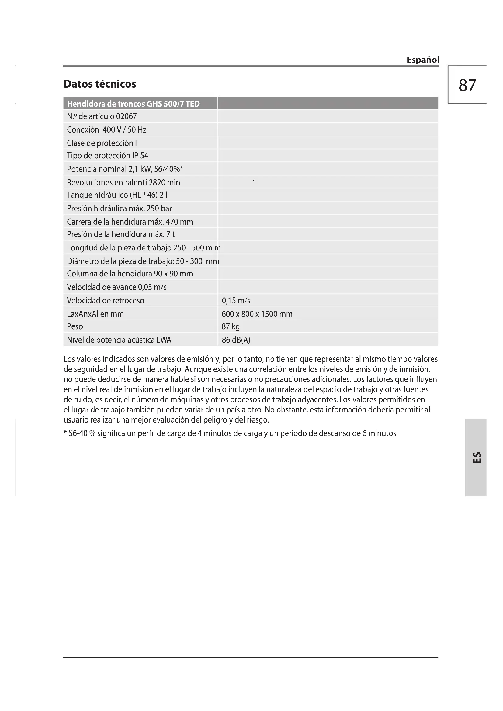 Español Datos técnicos Hendidora de troncos GHS 500/7 TED N.º de artículo 02067 Conexión 400 V / 50 Hz Clase de protección F Tipo de protección IP 54 Potencia nominal 2,1 kW, S6/40%* Revoluciones en ralentí 2820 min