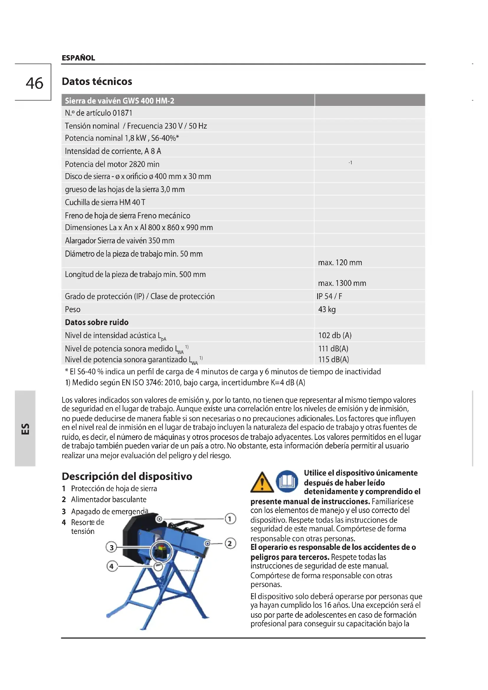 Los valores indicados son valores de emisión y, por lo tanto, no tienen que representar al mismo tiempo valores de seguridad en el lugar de trabajo. Aunque existe una correlación entre los niveles de emisión y de inmisión, no puede deducirse de manera able si son necesarias o no precauciones adicionales. Los factores que inuyen en el nivel real de inmisión en el lugar de trabajo incluyen la naturaleza del espacio de trabajo y otras fuentes de ruido, es decir, el número de máquinas y otros procesos de trabajo adyacentes. Los valores permitidos en el lugar de trabajo también pueden variar de un país a otro. No obstante, esta información debería permitir al usuario realizar una mejor evaluación del peligro y del riesgo. Descripción del dispositivo 1 Protección de hoja de sierra 2 Alimentador basculante 3 Apagado de emergencia 4 Resorte de tensión