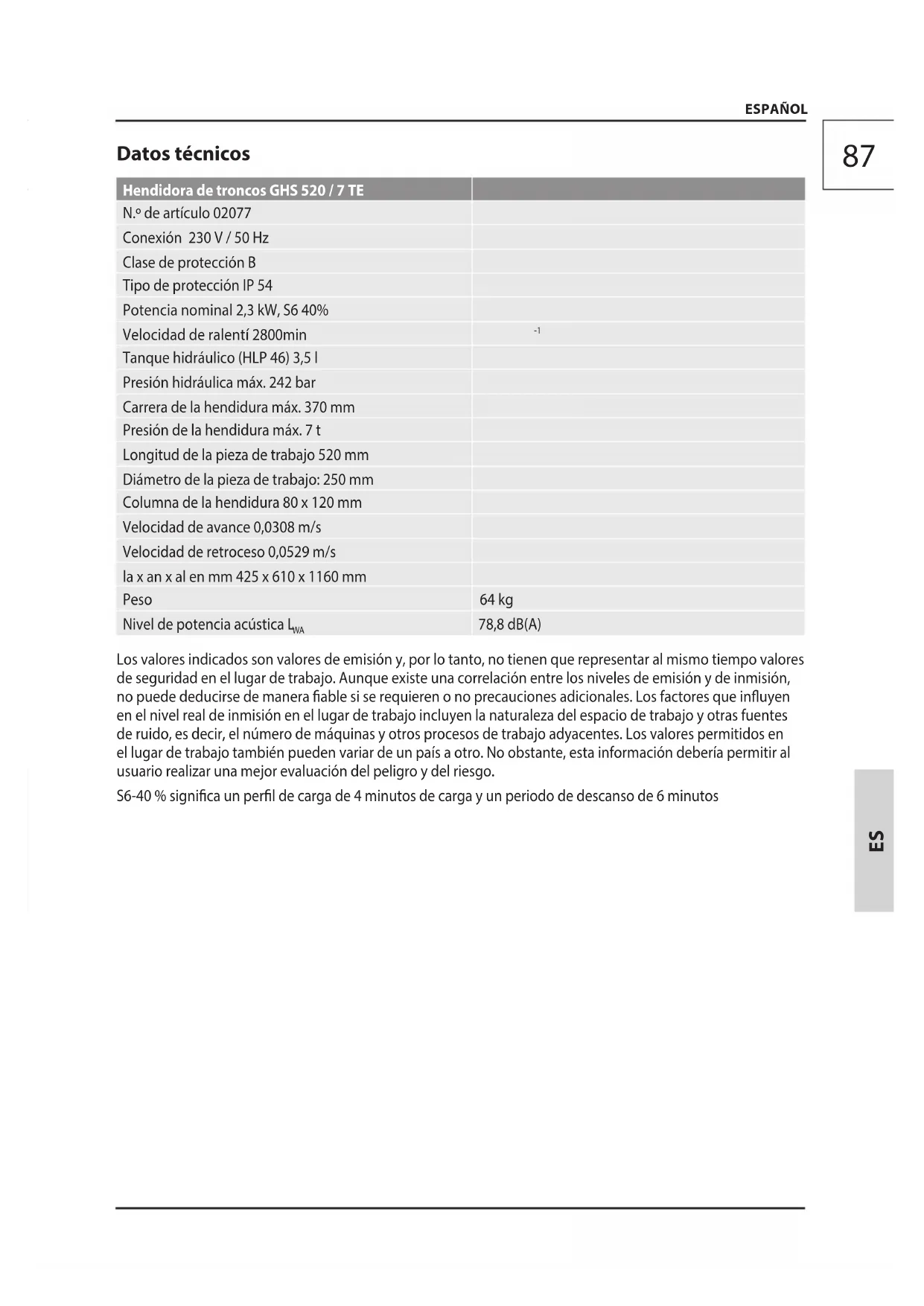 ESPAÑOL Datos técnicos Hendidora de troncos GHS 520 / 7 TE N.º de artículo 02077 Conexión 230 V / 50 Hz Clase de protección B Tipo de protección IP 54 Potencia nominal 2,3 kW, S6 40% Velocidad de ralentí 2800min