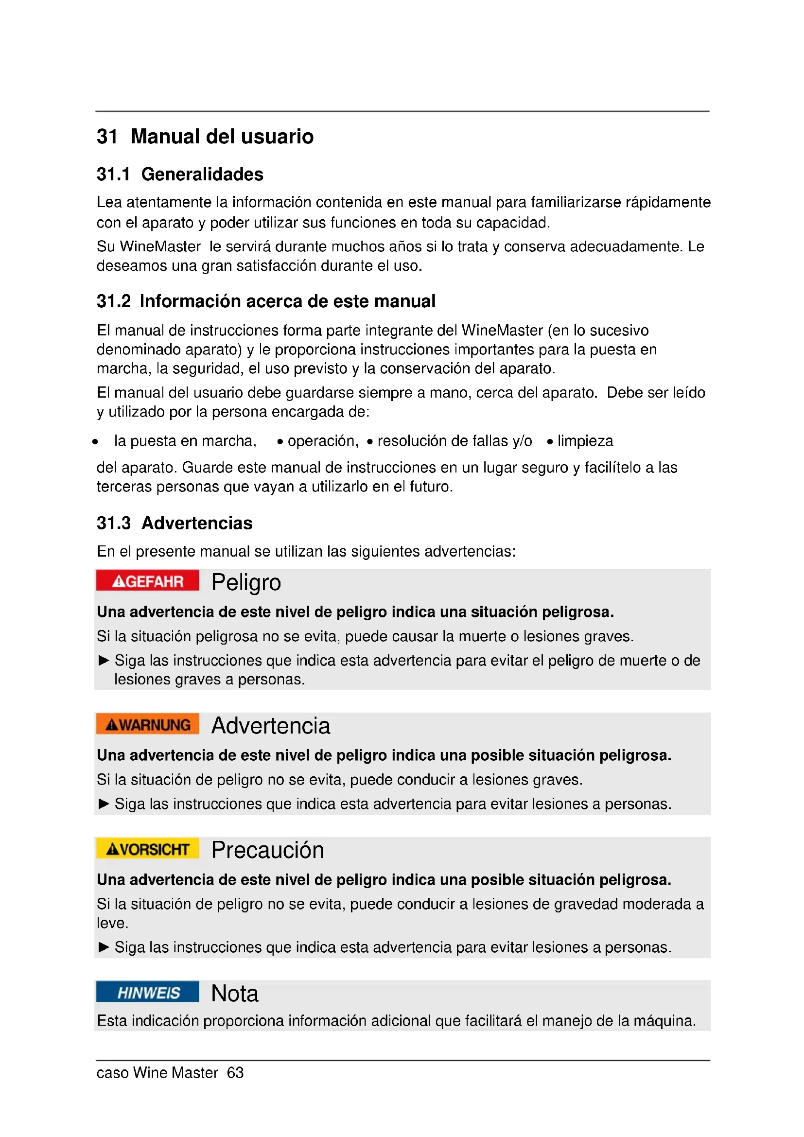 En el presente manual se utilizan las siguientes advertencias: Peligro Una advertencia de este nivel de peligro indica una situación peligrosa. Si la situación peligrosa no se evita, puede causar la muerte o lesiones graves. ► Siga las instrucciones que indica esta advertencia para evitar el peligro de muerte o de lesiones graves a personas. Advertencia Una advertencia de este nivel de peligro indica una posible situación peligrosa. Si la situación de peligro no se evita, puede conducir a lesiones graves. ► Siga las instrucciones que indica esta advertencia para evitar lesiones a personas. Precaución Una advertencia de este nivel de peligro indica una posible situación peligrosa. Si la situación de peligro no se evita, puede conducir a lesiones de gravedad moderada a leve. ► Siga las instrucciones que indica esta advertencia para evitar lesiones a personas. Nota Esta indicación proporciona información adicional que facilitará el manejo de la máquina.caso Wine Master 64