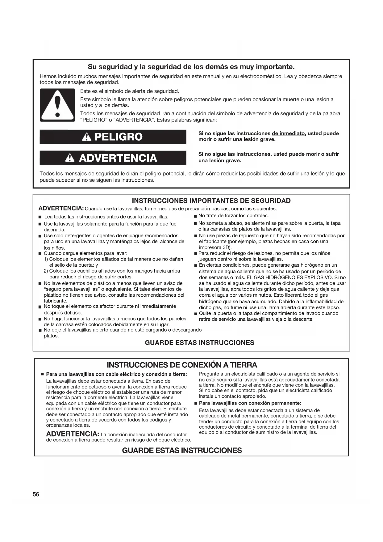 Si no sigue las instrucciones de inmediato, usted puede morir o sufrir una lesión grave. Si no sigue las instrucciones, usted puede morir o sufrir una lesión grave. Todos los mensajes de seguridad le dirán el peligro potencial, le dirán cómo reducir las posibilidades de sufrir una lesión y lo que puede suceder si no se siguen las instrucciones. Su seguridad y la seguridad de los demás es muy importante. Hemos incluido muchos mensajes importantes de seguridad en este manual y en su electrodoméstico. Lea y obedezca siempre todos los mensajes de seguridad. ADVERTENCIA PELIGRO Este es el símbolo de alerta de seguridad.Este símbolo le llama la atención sobre peligros potenciales que pueden ocasionar la muerte o una lesión a usted y a los demás.Todos los mensajes de seguridad irán a continuación del símbolo de advertencia de seguridad y de la palabra “PELIGRO” o “ADVERTENCIA”. Estas palabras significan: GUARDEESTASINSTRUCCIONES En ciertas condiciones, puede generarse gas hidrógeno en un sistema de agua caliente que no se ha usado por un período de dos semanas o más. EL GAS HIDRÓGENO ES EXPLOSIVO. Si no se ha usado el agua caliente durante dicho período, antes de usar la lavavajillas, abra todos los grifos de agua caliente y deje que corra el agua por varios minutos. Esto liberará todo el gas hidrógeno que se haya acumulado. Debido a la inflamabilidad de dicho gas, no fume ni use una llama abierta durante este lapso. INSTRUCCIONESIMPORTANTESDESEGURIDAD ADVERTENCIA: Cuando use la lavavajillas, tome medidas de precaución básicas, como las siguientes: Lea todas las instrucciones antes de usar la lavavajillas.Use la lavavajillas solamente para la función para la que fue diseñada.Use solo detergentes o agentes de enjuague recomendados para uso en una lavavajillas y manténgalos lejos del alcance de los niños. Cuando cargue elementos para lavar:1) Coloque los elementos afilados de tal manera que no dañen el sello de la puerta; y 2) Coloque los cuchillos afilados con los mangos hacia arriba para reducir el riesgo de sufrir cortes. No lave elementos de plástico a menos que lleven un aviso de “seguro para lavavajillas” o equivalente. Si tales elementos de plástico no tienen ese aviso, consulte las recomendaciones del fabricante. No toque el elemento calefactor durante ni inmediatamente después del uso. No haga funcionar la lavavajillas a menos que todos los paneles de la carcasa estén colocados debidamente en su lugar. No deje el lavavajillas abierto cuando no esté cargando o descargandoplatos. No trate de forzar los controles. No someta a abuso, se siente ni se pare sobre la puerta, la tapa o las canastas de platos de la lavavajillas. No use piezas de repuesto que no hayan sido recomendadas por el fabricante (por ejemplo, piezas hechas en casa con una impresora 3D).Para reducir el riesgo de lesiones, no permita que los niñosjueguen dentro ni sobre la lavavajillas. Quite la puerta o la tapa del compartimiento de lavado cuando retire de servicio una lavavajillas vieja o la descarte.
