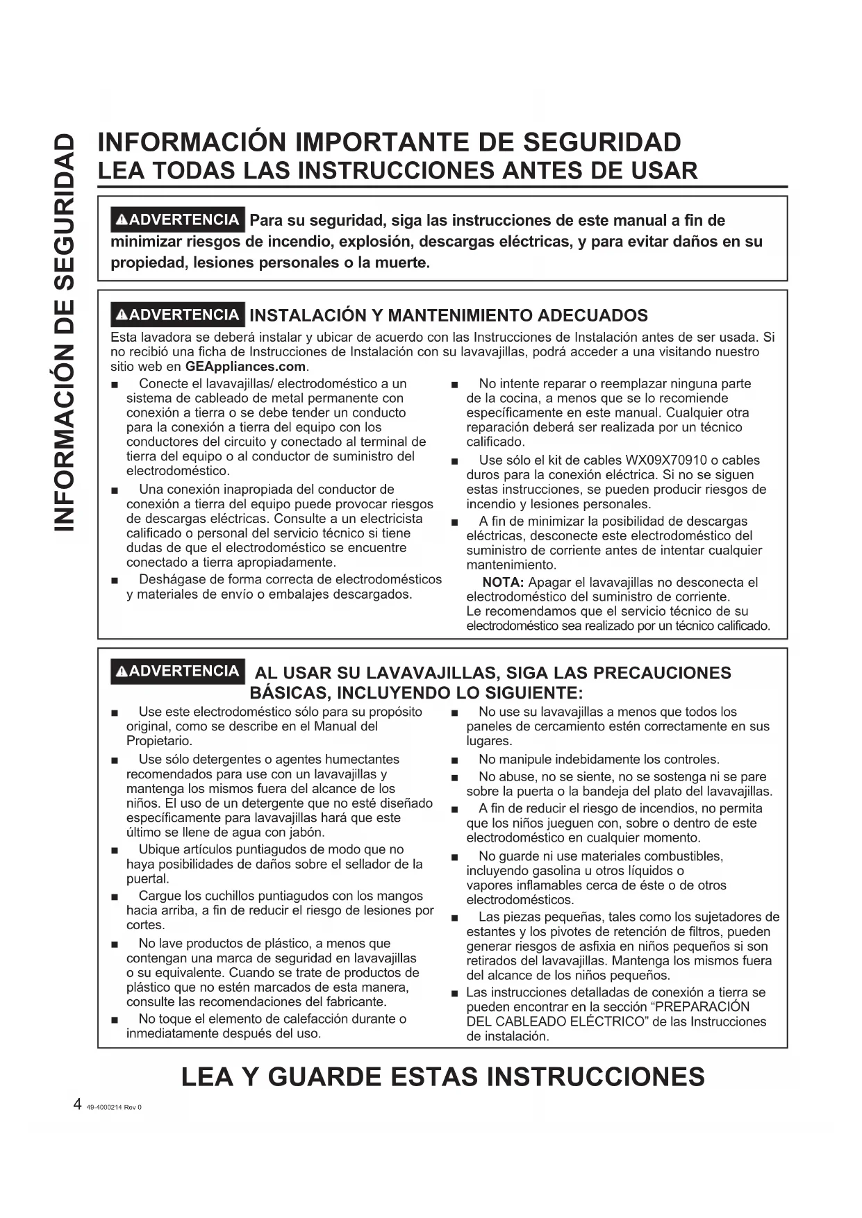 Esta lavadora se deberá instalar y ubicar de acuerdo con las Instrucciones de Instalación antes de ser usada. Si no recibió una ficha de Instrucciones de Instalación con su lavavajillas, podrá acceder a una visitando nuestro sitio web en GEAppliances.com.■ Conecteellavavajillas/electrodomésticoaunsistema de cableado de metal permanente con conexión a tierra o se debe tender un conducto para la conexión a tierra del equipo con los conductores del circuito y conectado al terminal de tierra del equipo o al conductor de suministro del electrodoméstico.■ Unaconexióninapropiadadelconductordeconexión a tierra del equipo puede provocar riesgos de descargas eléctricas. Consulte a un electricista calificado o personal del servicio técnico si tiene dudas de que el electrodoméstico se encuentre conectado a tierra apropiadamente.■ Deshágasedeformacorrectadeelectrodomésticosy materiales de envío o embalajes descargados.■ Nointenterepararoreemplazarningunapartede la cocina, a menos que se lo recomiende específicamente en este manual. Cualquier otra reparación deberá ser realizada por un técnico calificado.■ UsesóloelkitdecablesWX09X70910ocablesduros para la conexión eléctrica. Si no se siguen estas instrucciones, se pueden producir riesgos de incendio y lesiones personales.■ Afindeminimizarlaposibilidaddedescargaseléctricas, desconecte este electrodoméstico del suministro de corriente antes de intentar cualquier mantenimiento. NOTA: Apagar el lavavajillas no desconecta el electrodoméstico del suministro de corriente. Le recomendamos que el servicio técnico de su electrodoméstico sea realizado por un técnico calificado. ADVERTENCIA AL USAR SU LAVAVAJILLAS, SIGA LAS PRECAUCIONES BÁSICAS, INCLUYENDO LO SIGUIENTE: ■ Useesteelectrodomésticosóloparasupropósitooriginal, como se describe en el Manual del Propietario.■ Usesólodetergentesoagenteshumectantesrecomendados para use con un lavavajillas y mantenga los mismos fuera del alcance de los niños. El uso de un detergente que no esté diseñado específicamente para lavavajillas hará que este último se llene de agua con jabón.■ Ubiqueartículospuntiagudosdemodoquenohaya posibilidades de daños sobre el sellador de la puertal.■ Cargueloscuchillospuntiagudosconlosmangoshacia arriba, a fin de reducir el riesgo de lesiones por cortes.■ Nolaveproductosdeplástico,amenosquecontengan una marca de seguridad en lavavajillas o su equivalente. Cuando se trate de productos de plástico que no estén marcados de esta manera, consulte las recomendaciones del fabricante.■ Notoqueelelementodecalefacciónduranteoinmediatamente después del uso.■ Nousesulavavajillasamenosquetodoslospaneles de cercamiento estén correctamente en sus lugares.■ Nomanipuleindebidamenteloscontroles.■ Noabuse,nosesiente,nosesostenganiseparesobre la puerta o la bandeja del plato del lavavajillas.■ Afindereducirelriesgodeincendios,nopermitaque los niños jueguen con, sobre o dentro de este electrodoméstico en cualquier momento.■ Noguardeniusematerialescombustibles,incluyendo gasolina u otros líquidos o vapores inflamables cerca de éste o de otros electrodomésticos.■ Laspiezaspequeñas,talescomolossujetadoresdeestantes y los pivotes de retención de filtros, pueden generar riesgos de asfixia en niños pequeños si son retirados del lavavajillas. Mantenga los mismos fuera del alcance de los niños pequeños. ■ Las instrucciones detalladas de conexión a tierra se puedenencontrarenlasección“PREPARACIÓNDELCABLEADOELÉCTRICO”delasInstruccionesde instalación.49-4000214 Rev 0 5