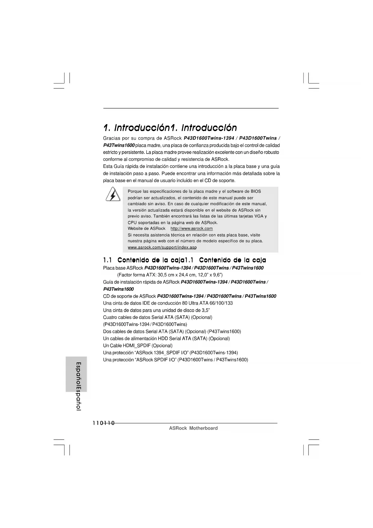 Gracias por su compra de ASRock P43D1600Twins-1394 / P43D1600Twins / P43Twins1600 placa madre, una placa de confianza producida bajo el control de calidad estricto y persistente. La placa madre provee realización excelente con un diseño robusto conforme al compromiso de calidad y resistencia de ASRock. Esta Guía rápida de instalación contiene una introducción a la placa base y una guía de instalación paso a paso. Puede encontrar una información más detallada sobre la placa base en el manual de usuario incluido en el CD de soporte.
