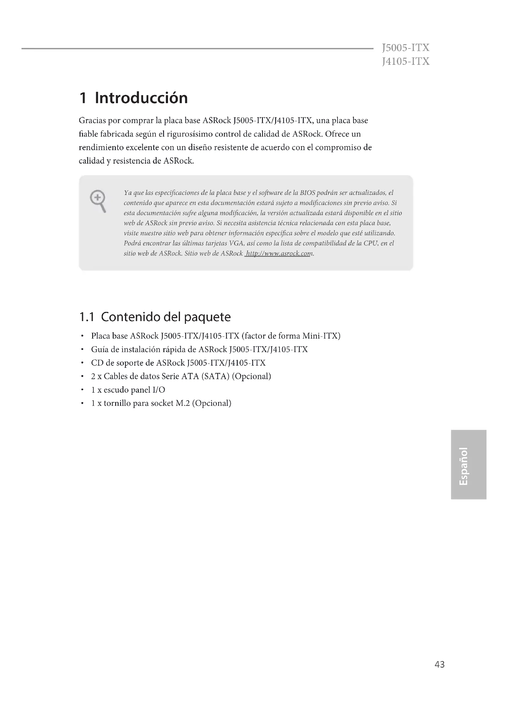 AN_VOLTAGE43 J5005-ITX J4105-ITX Español 1 Introducción Gracias por comprar la placa base ASRock J5005-ITX/J4105-ITX, una placa base able fabricada según el rigurosísimo control de calidad de ASRock. Ofrece un rendimiento excelente con un diseño resistente de acuerdo con el compromiso de calidad y resistencia de ASRock.