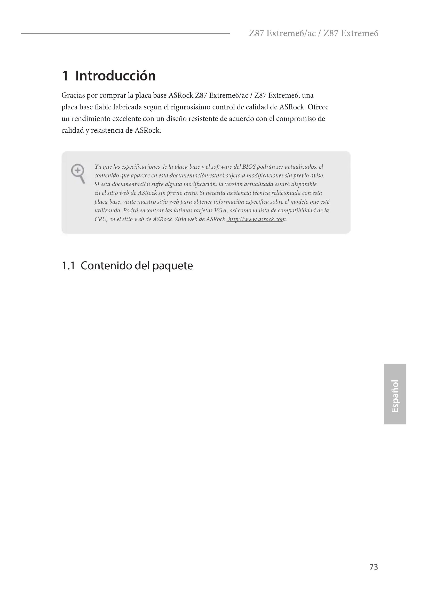 - 2 cables de antena WiFi SMA (sólo para Z87 Extreme6/ac) Ya que las especicaciones de la placa base y el soware del BIOS podrán ser actualizados, el contenido que aparece en esta documentación estará sujeto a modicaciones sin previo aviso. Si esta documentación sufre alguna modicación, la versión actualizada estará disponible en el sitio web de ASRock sin previo aviso. Si necesita asistencia técnica relacionada con esta placa base, visite nuestro sitio web para obtener información especíca sobre el modelo que esté utilizando. Podrá encontrar las últimas tarjetas VGA, así como la lista de compatibilidad de la CPU, en el sitio web de ASRock. Sitio web de ASRock http://www.asrock.com.74 Español