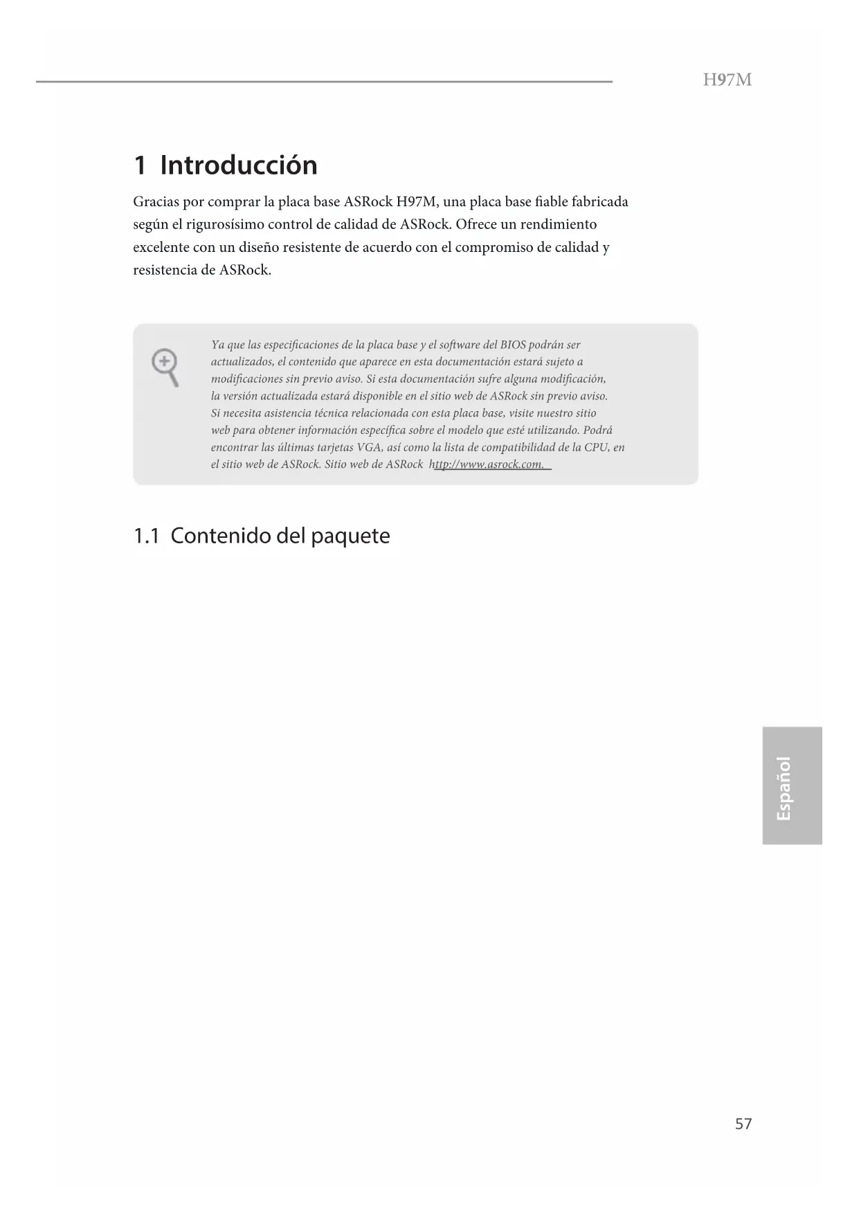 Español 1 Introducción Gracias por comprar la placa base ASRock H97M, una placa base able fabricada según el rigurosísimo control de calidad de ASRock. Ofrece un rendimiento excelente con un diseño resistente de acuerdo con el compromiso de calidad y resistencia de ASRock.