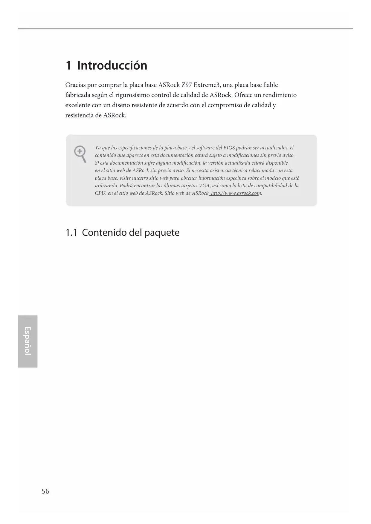 - 1 tarjeta ASRock SLI_Bridge_2S Ya que las especicaciones de la placa base y el soware del BIOS podrán ser actualizados, el contenido que aparece en esta documentación estará sujeto a modicaciones sin previo aviso. Si esta documentación sufre alguna modicación, la versión actualizada estará disponible en el sitio web de ASRock sin previo aviso. Si necesita asistencia técnica relacionada con esta placa base, visite nuestro sitio web para obtener información especíca sobre el modelo que esté utilizando. Podrá encontrar las últimas tarjetas VGA, así como la lista de compatibilidad de la CPU, en el sitio web de ASRock. Sitio web de ASRock http://www.asrock.com.57 Español Z97 Extreme3