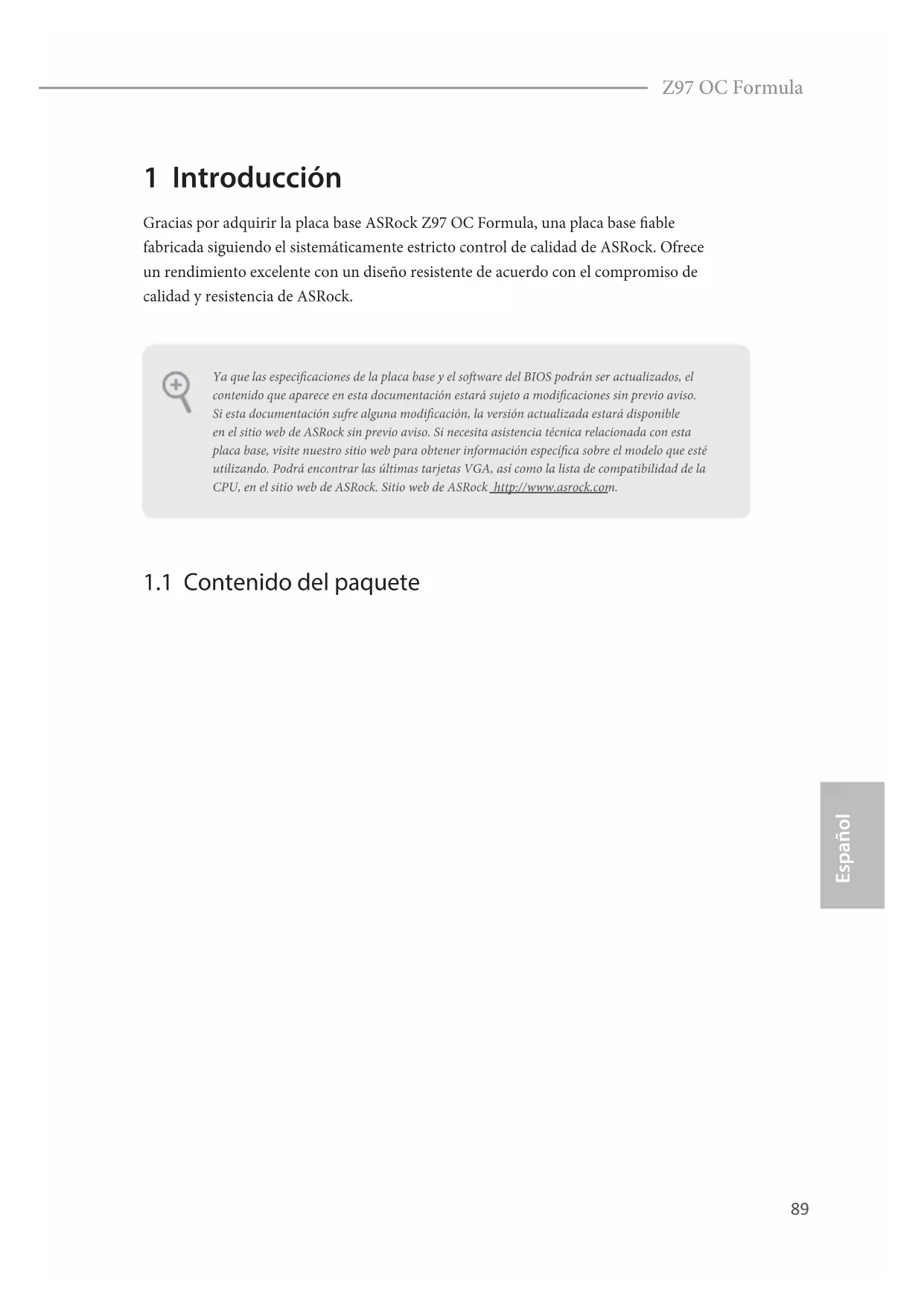 OFF89 Español Z97 OC Formula 1 Introducción Gracias por adquirir la placa base ASRock Z97 OC Formula, una placa base able fabricada siguiendo el sistemáticamente estricto control de calidad de ASRock. Ofrece un rendimiento excelente con un diseño resistente de acuerdo con el compromiso de calidad y resistencia de ASRock.