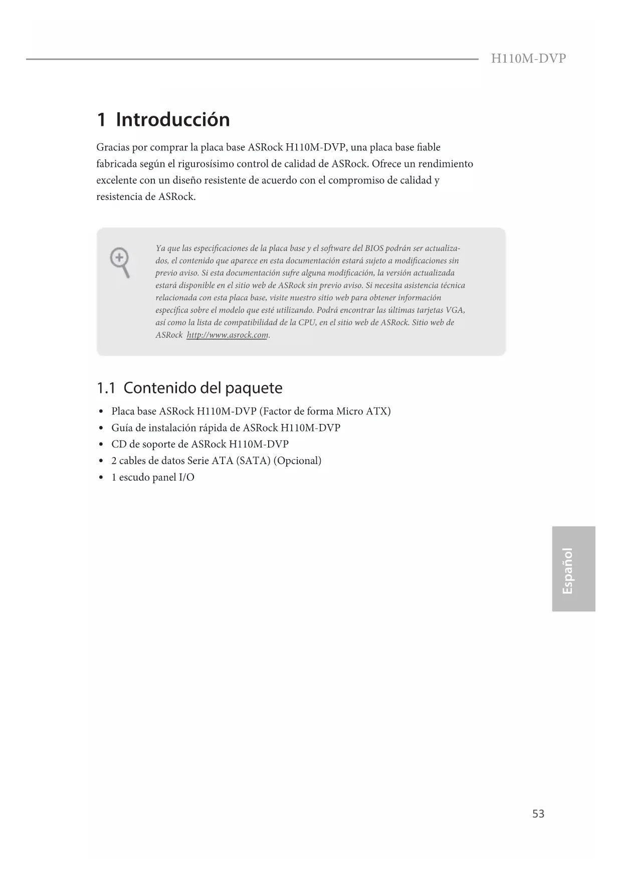 Español H110M-DVP 1 Introducción Gracias por comprar la placa base ASRock H110M-DVP, una placa base able fabricada según el rigurosísimo control de calidad de ASRock. Ofrece un rendimiento excelente con un diseño resistente de acuerdo con el compromiso de calidad y resistencia de ASRock.