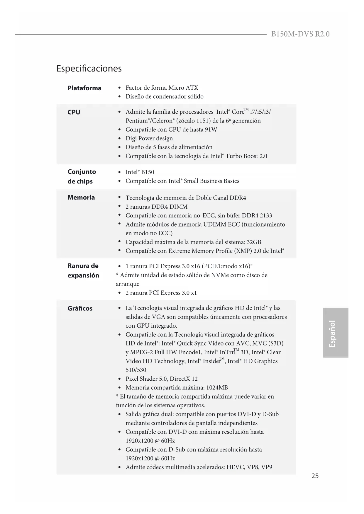 La Tecnología visual integrada de grácos HD de Intel® y las salidas de VGA son compatibles únicamente con procesadores con GPU integrado.