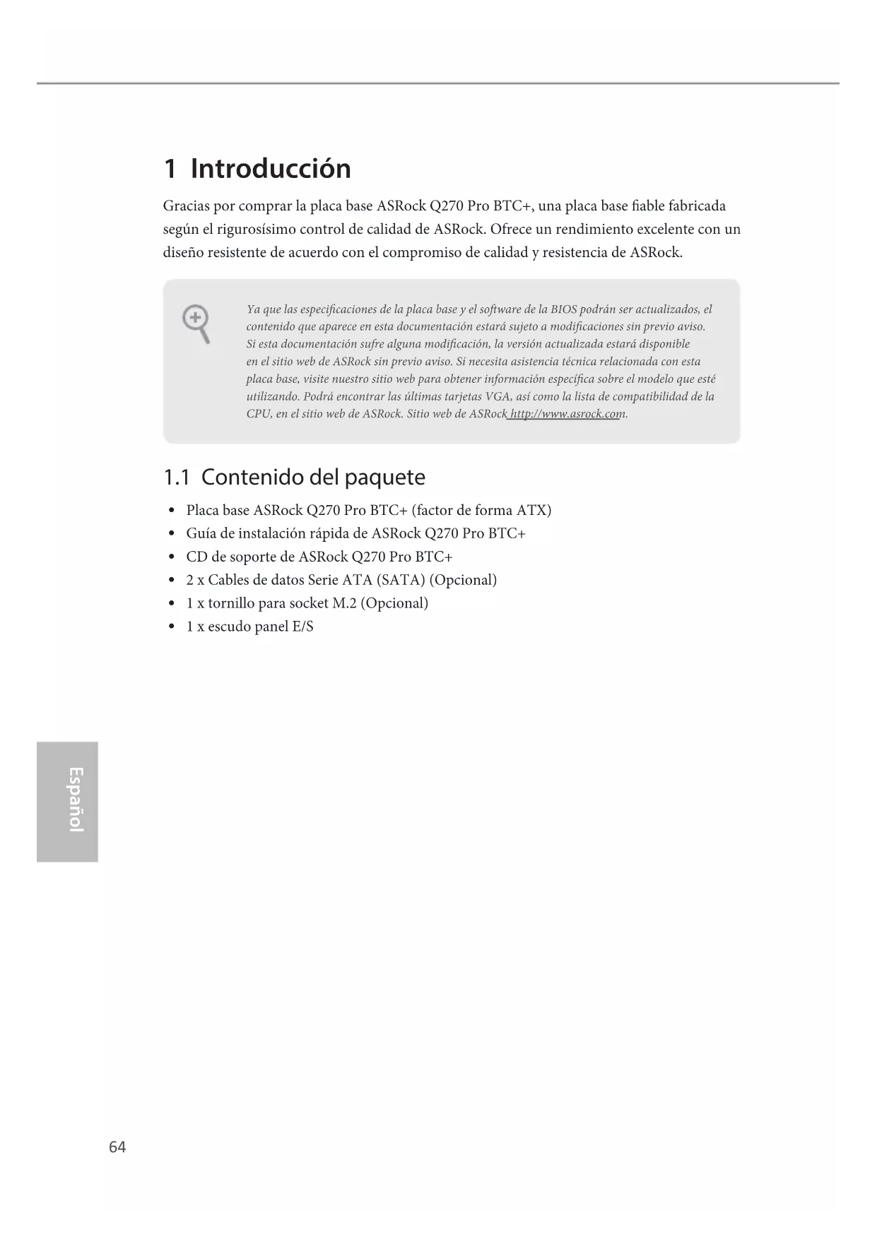 La scheda madre è dotata di due tasto smart: Tasto di alimentazione e di ripristino. Tasto d’alimentazione (PWRBTN1) (vedere pag. 1, n. 4) Il tasto d’alimentazione consente di accendere/spegnere rapidamente il sistema. Tasto di ripristino (RSTBTN1) (vedere pag. 1, n. 5) Il tasto di ripristino consente di ripristinare rapidamente il sistema.64 Español 1 Introducción Gracias por comprar la placa base ASRock Q270 Pro BTC+, una placa base able fabricada según el rigurosísimo control de calidad de ASRock. Ofrece un rendimiento excelente con un diseño resistente de acuerdo con el compromiso de calidad y resistencia de ASRock. Ya que las especicaciones de la placa base y el soware de la BIOS podrán ser actualizados, el contenido que aparece en esta documentación estará sujeto a modicaciones sin previo aviso. Si esta documentación sufre alguna modicación, la versión actualizada estará disponible en el sitio web de ASRock sin previo aviso. Si necesita asistencia técnica relacionada con esta placa base, visite nuestro sitio web para obtener información especíca sobre el modelo que esté utilizando. Podrá encontrar las últimas tarjetas VGA, así como la lista de compatibilidad de la CPU, en el sitio web de ASRock. Sitio web de ASRock http://www.asrock.com.