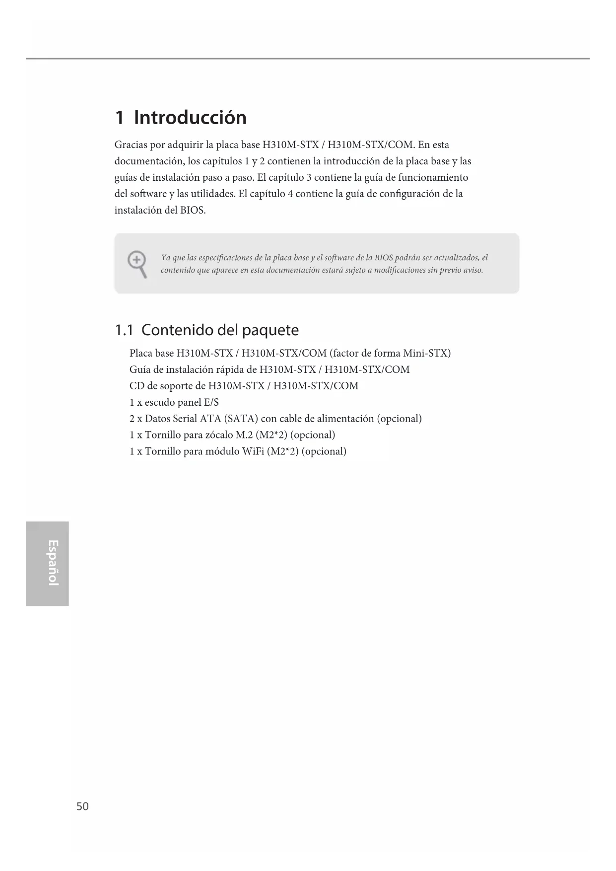 GND Jack detectAudio-LAudio-R50 Español 1 Introducción Gracias por adquirir la placa base H310M-STX / H310M-STX/COM. En esta documentación, los capítulos 1 y 2 contienen la introducción de la placa base y las guías de instalación paso a paso. El capítulo 3 contiene la guía de funcionamiento del soware y las utilidades. El capítulo 4 contiene la guía de conguración de la instalación del BIOS.