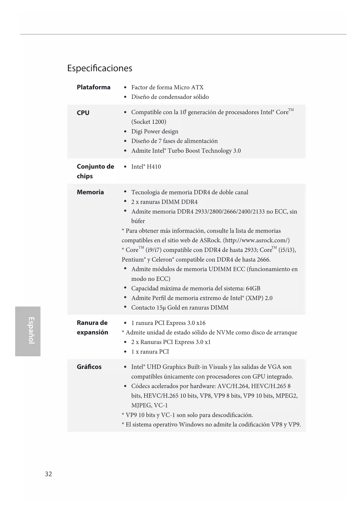 - El sistema operativo Windows no admite la codicación VP8 y VP9.33 H410M-HDVP H410M-HDVP2 Español