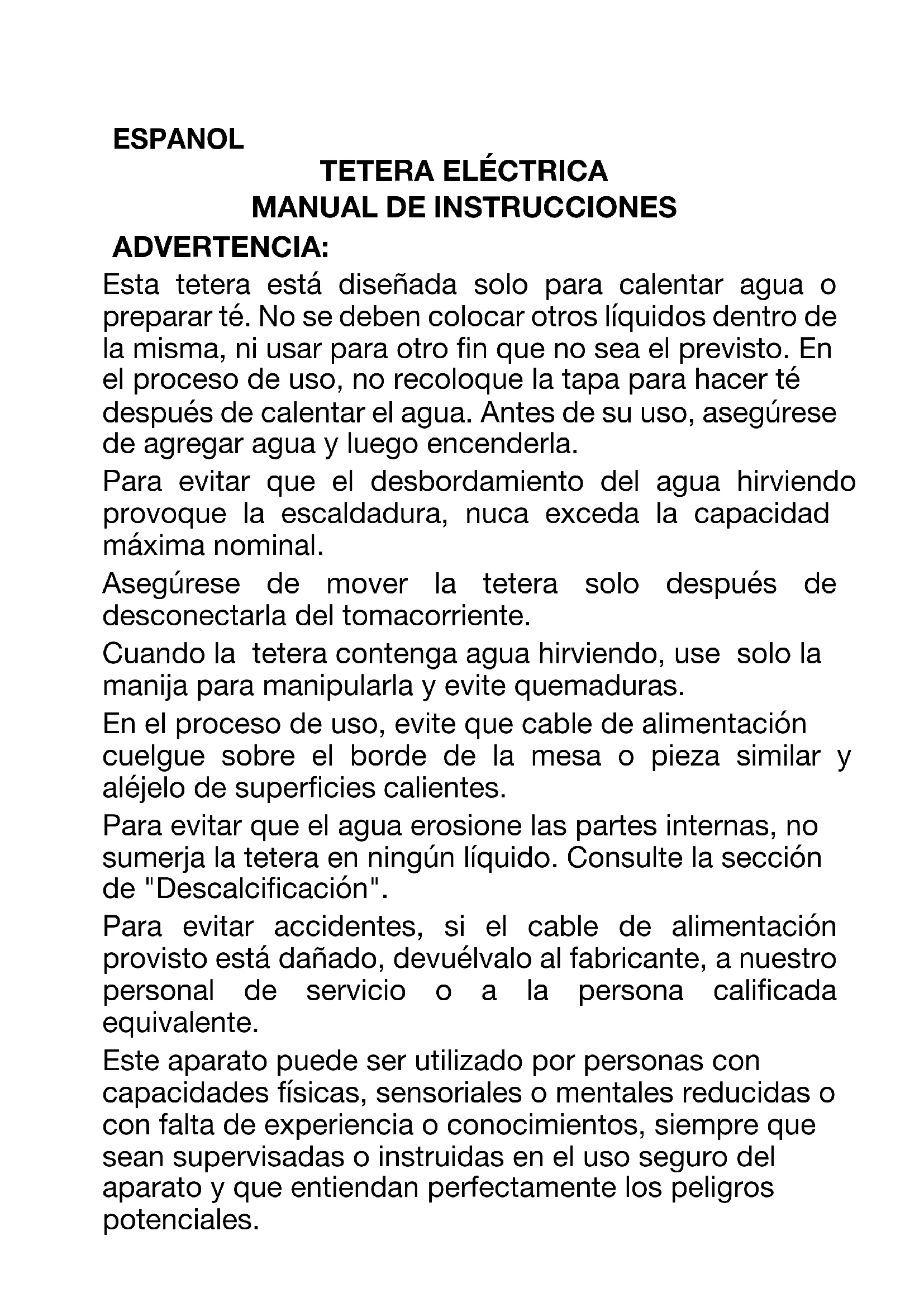ADVERTENCIA: Esta tetera está diseñada solo para calentar agua o preparar té. No se deben colocar otros líquidos dentro de la misma, ni usar para otro fin que no sea el previsto. En el proceso de uso, no recoloque la tapa para hacer té después de calentar el agua. Antes de su uso, asegúrese de agregar agua y luego encenderla. Para evitar que el desbordamiento del agua hirviendo provoque la escaldadura, nuca exceda la capacidad máxima nominal. Asegúrese de mover la tetera solo después de desconectarla del tomacorriente. Cuando la tetera contenga agua hirviendo, use solo la manija para manipularla y evite quemaduras. En el proceso de uso, evite que cable de alimentación cuelgue sobre el borde de la mesa o pieza similar y aléjelo de superficies calientes. Para evitar que el agua erosione las partes internas, no sumerja la tetera en ningún líquido. Consulte la sección de "Descalcificación". Para evitar accidentes, si el cable de alimentación provisto está dañado, devuélvalo al fabricante, a nuestro personal de servicio o a la persona calificada equivalente. Este aparato puede ser utilizado por personas con capacidades físicas, sensoriales o mentales reducidas o con falta de experiencia o conocimientos, siempre que sean supervisadas o instruidas en el uso seguro del aparato y que entiendan perfectamente los peligros potenciales.Los niños deben ser supervisados para asegurarse de que no jueguen con la tetera.