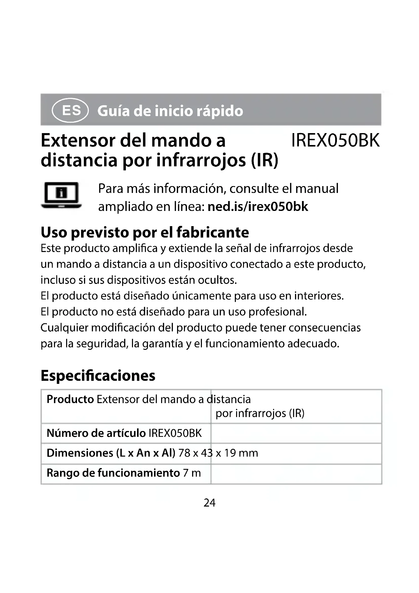 Guía de inicio rápido Extensor del mando a distancia por infrarrojos (IR) IREX050BK Para más información, consulte el manual ampliado en línea: ned.is/irex050bk Uso previsto por el fabricante Este producto amplica y extiende la señal de infrarrojos desde un mando a distancia a un dispositivo conectado a este producto, incluso si sus dispositivos están ocultos. El producto está diseñado únicamente para uso en interiores. El producto no está diseñado para un uso profesional. Cualquier modicación del producto puede tener consecuencias para la seguridad, la garantía y el funcionamiento adecuado. Especicaciones Producto Extensor del mando a distancia por infrarrojos (IR) Número de artículo IREX050BK Dimensiones (L x An x Al) 78 x 43 x 19 mm Rango de funcionamiento 7 m25 Rango de frecuencia de infrarrojos