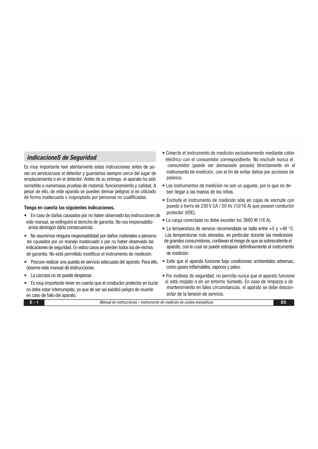 - Pormotivosdeseguridad,nopermitanuncaqueelaparatofuncione si está mojado o en un entorno húmedo. En caso de limpieza o de mantenimiento en tales circunstancias, el aparato se debe descon- ectar de la tensión de servicio.ES Manual de instrucciones – Instrumento de medición de costes energéticos E - 2