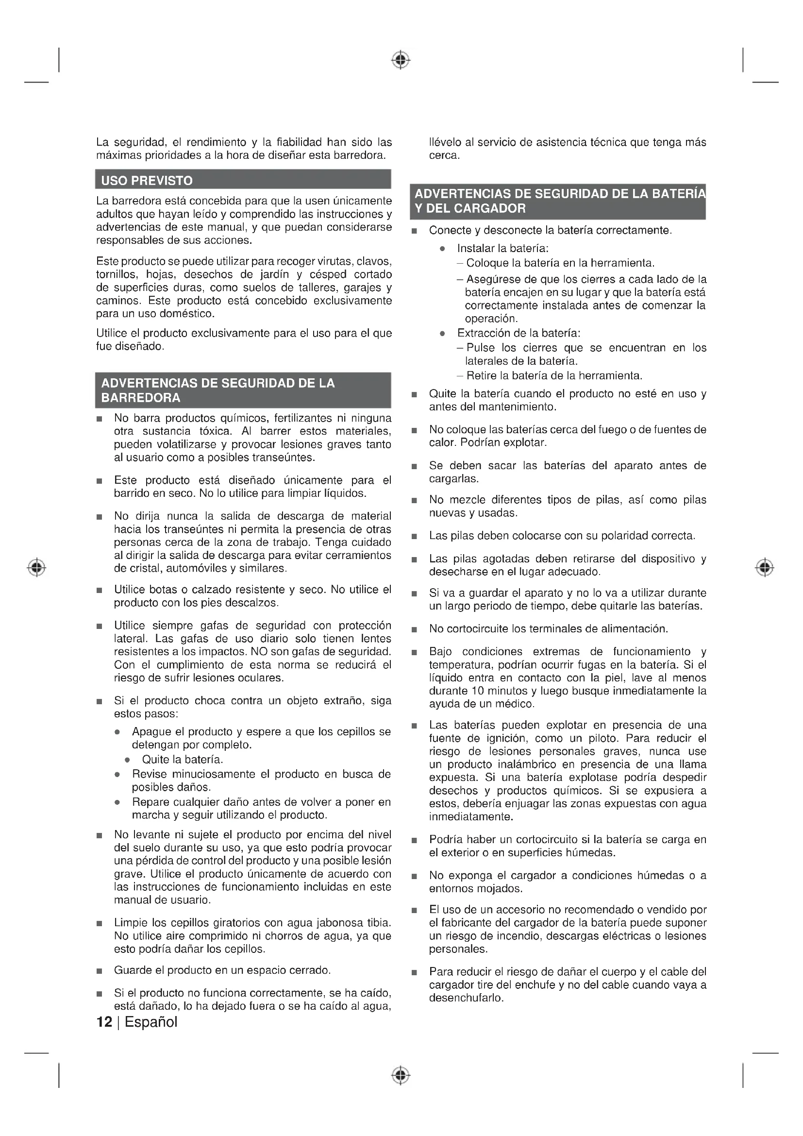 BARREDORA Ŷ No barra productos químicos, fertilizantes ni ninguna otra sustancia tóxica. Al barrer estos materiales, pueden volatilizarse y provocar lesiones graves tanto al usuario como a posibles transeúntes. Ŷ Este producto está diseñado únicamente para el barrido en seco. No lo utilice para limpiar líquidos. Ŷ No dirija nunca la salida de descarga de material hacia los transeúntes ni permita la presencia de otras personas cerca de la zona de trabajo. Tenga cuidado al dirigir la salida de descarga para evitar cerramientos de cristal, automóviles y similares. Ŷ Utilice botas o calzado resistente y seco. No utilice el producto con los pies descalzos. Ŷ Utilice siempre gafas de seguridad con protección lateral. Las gafas de uso diario solo tienen lentes resistentes a los impactos. NO son gafas de seguridad. Con el cumplimiento de esta norma se reducirá el riesgo de sufrir lesiones oculares. Ŷ Si el producto choca contra un objeto extraño, siga estos pasos: Ɣ Apague el producto y espere a que los cepillos se detengan por completo. Ɣ Quite la batería. Ɣ Revise minuciosamente el producto en busca de posibles daños. Ɣ Repare cualquier daño antes de volver a poner en marcha y seguir utilizando el producto. Ŷ No levante ni sujete el producto por encima del nivel del suelo durante su uso, ya que esto podría provocar una pérdida de control del producto y una posible lesión grave. Utilice el producto únicamente de acuerdo con las instrucciones de funcionamiento incluidas en este manual de usuario. Ŷ Limpie los cepillos giratorios con agua jabonosa tibia. No utilice aire comprimido ni chorros de agua, ya que esto podría dañar los cepillos. Ŷ Guarde el producto en un espacio cerrado. Ŷ Si el producto no funciona correctamente, se ha caído, está dañado, lo ha dejado fuera o se ha caído al agua, llévelo al servicio de asistencia técnica que tenga más cerca. ADVERTENCIAS DE SEGURIDAD DE LA BATERÍA