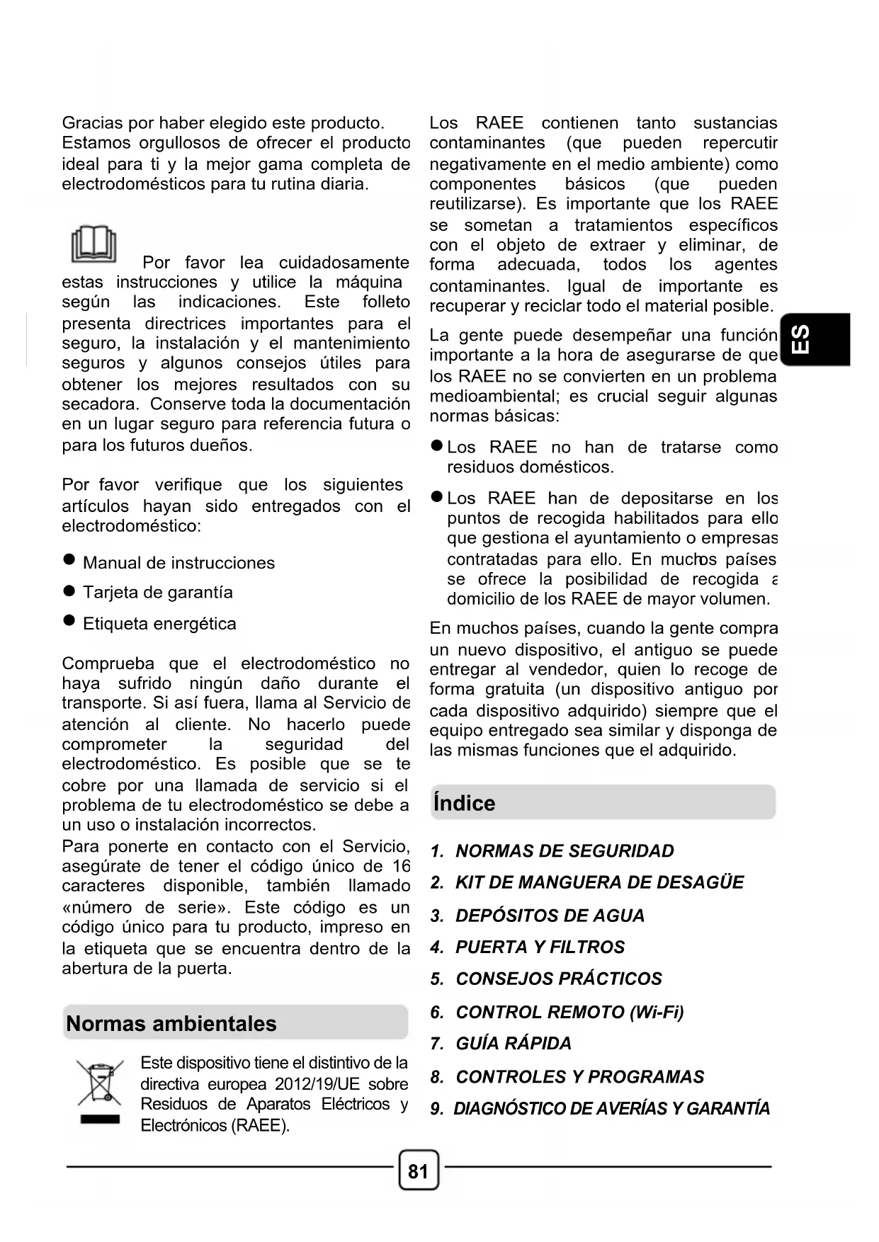 Al mostrar el logo marcado en este producto, declaramos, bajo nuestra propia responsabilidad, el cumplimiento de todos los requisitos europeos en términos de seguridad, salud y medio ambiente, establecidos en la legislación de este producto. Por razones de seguridad cuando se deseche una secadora, desenchufe el cable eléctrico de la toma general, corte el cable y destrúyalo junto con el enchufe. Para evitar que los niños se queden encerrados en la máquina, rompa las bisagras o la cerradura de la puerta. El fabricante no se responsabiliza por eventuales erratas de imprenta contenidas en el presente manual de instrucciones. Asimismo, se reserva el derecho de efectuar las modificaciones que considere oportunas para sus productos sin comprometer sus características fundamentales.