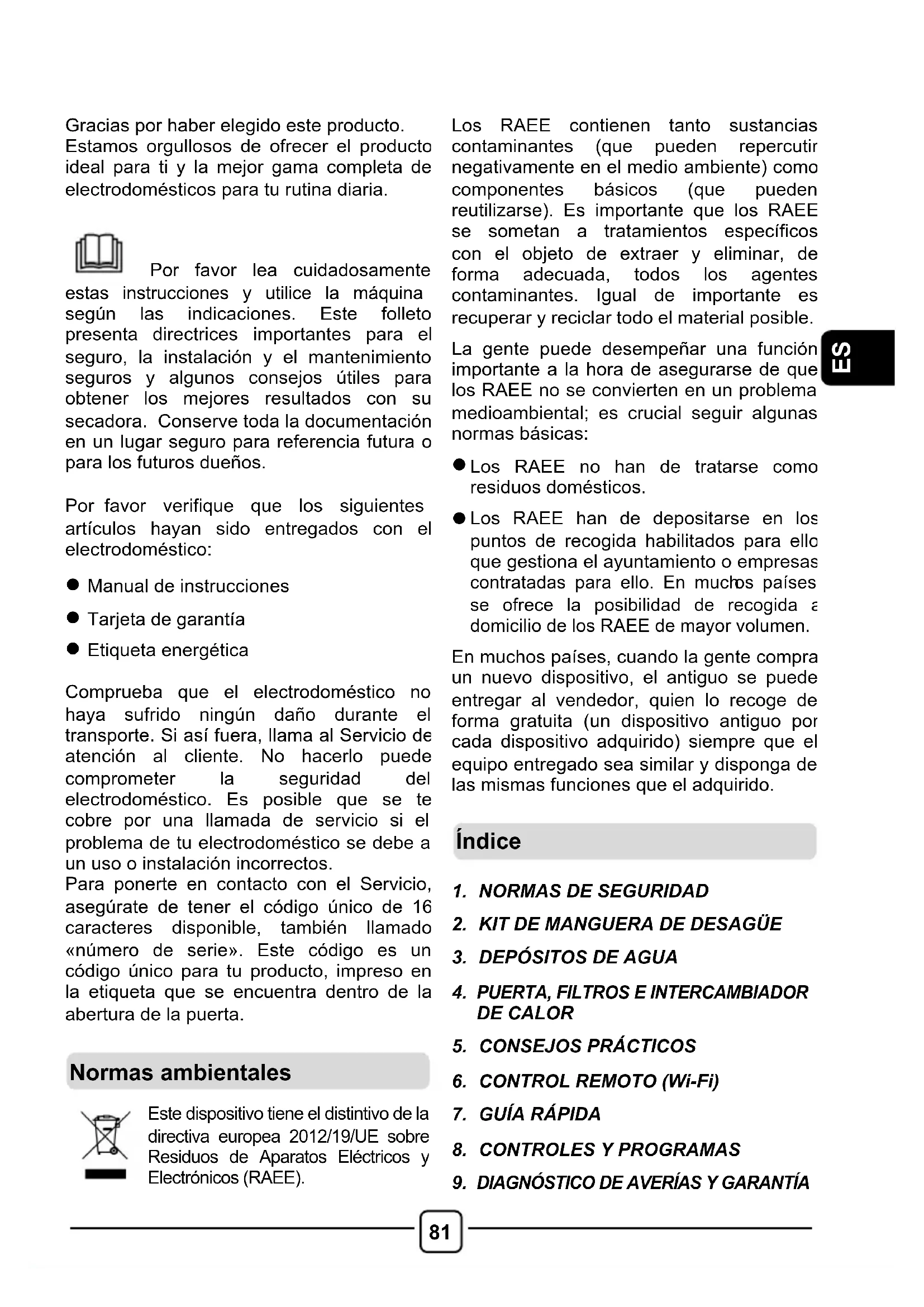 Antes de utilizar el electrodoméstico asegúrese de haber comprendido bien las instrucciones de instalación y uso. No toque el electrodoméstico cuando tenga las manos o los pies mojados o húmedos. No se apoye en la puerta al cargar la secadora ni utilice la puerta para levantar o mover la máquina. ATENCIÓN El uso incorrecto de una secadora puede provocar riesgo de incendio.83