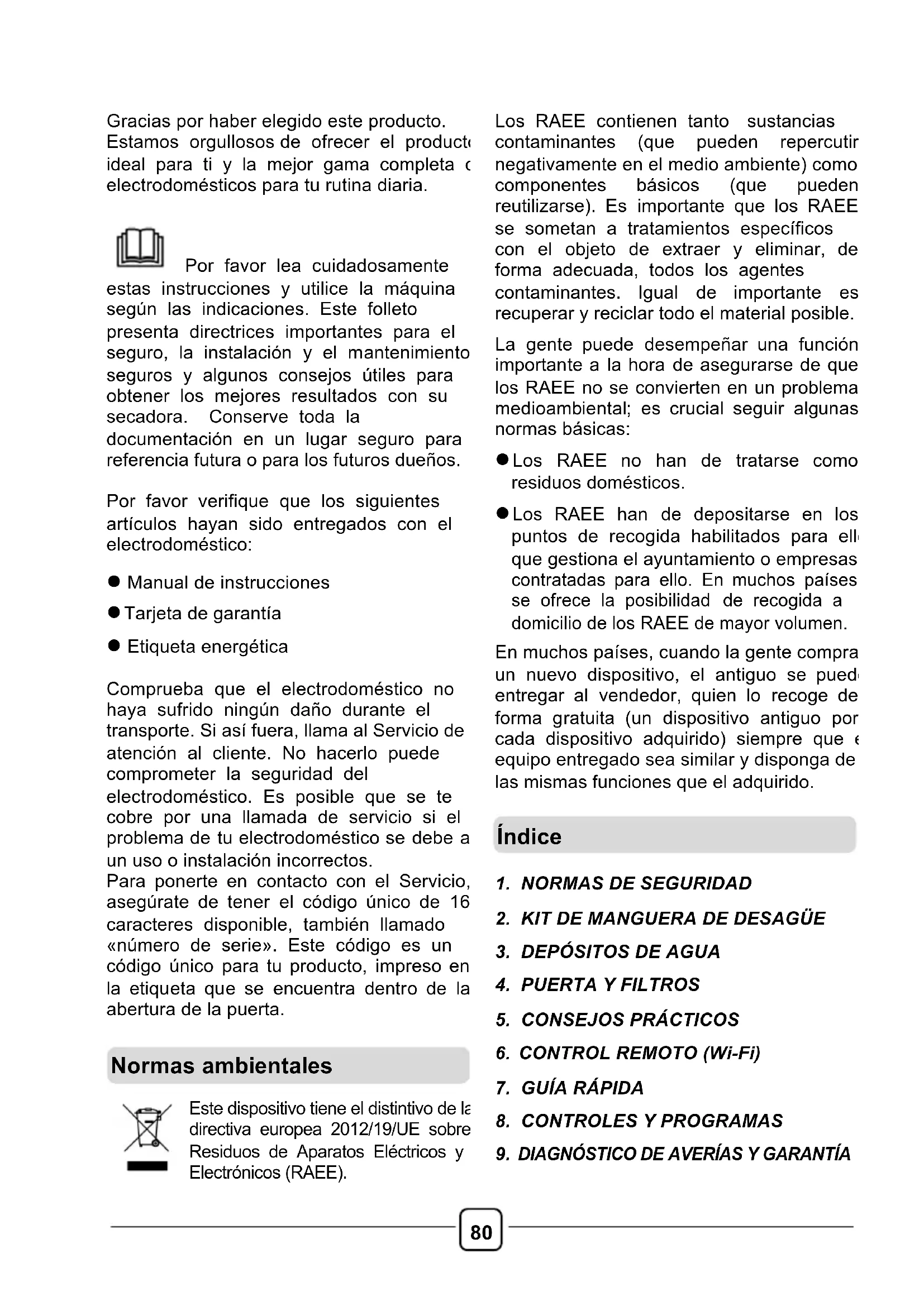 Gracias por haber elegido este producto. Estamos orgullosos de ofrecer el producto ideal para ti y la mejor gama completa de electrodomésticos para tu rutina diaria. Por favor lea cuidadosamente estas instrucciones y utilice la máquina según las indicaciones. Este folleto presenta directrices importantes para el seguro, la instalación y el mantenimiento seguros y algunos consejos útiles para obtener los mejores resultados con su secadora. Conserve toda la documentación en un lugar seguro para referencia futura o para los futuros dueños. Por favor verifique que los siguientes artículos hayan sido entregados con el electrodoméstico: ! Manual de instrucciones ! Tarjeta de garantía ! Etiqueta energética Comprueba que el electrodoméstico no haya sufrido ningún daño durante el transporte. Si así fuera, llama al Servicio de atención al cliente. No hacerlo puede comprometer la seguridad del electrodoméstico. Es posible que se te cobre por una llamada de servicio si el problema de tu electrodoméstico se debe a un uso o instalación incorrectos. Para ponerte en contacto con el Servicio, asegúrate de tener el código único de 16 caracteres disponible, también llamado «número de serie». Este código es un código único para tu producto, impreso en la etiqueta que se encuentra dentro de la abertura de la puerta.