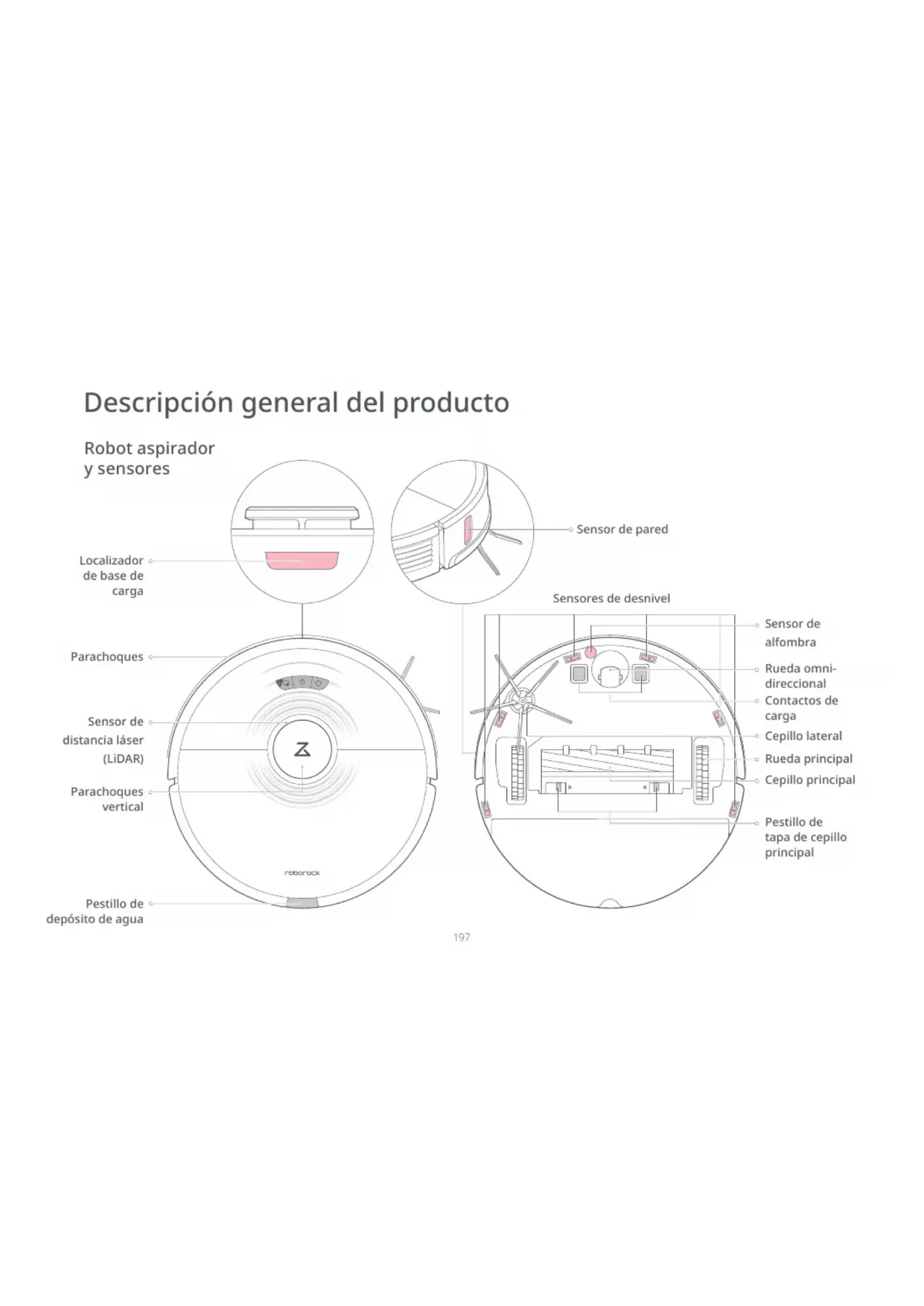 EDVHVHYHQGHSRUVHSDUDGR 9LVLWHZZZURERURFNFRPSDUD REWHQHUP£VLQIRUPDFLµQ Robot Restablecer sistema Ranuras de ventilación Soporte de paño de fregado VibraRise Depósito de agua ,QGLFDGRUGHZLࢉ Depósito de polvo 7DSDGHࢉOWUR Pestillo de depósito de polvo Filtro lavable Pestillo de tapa GHࢉOWUR Descripción general del producto Entrada de aire Nota: Robot aspirador y sensores Localizador de base de carga Parachoques Sensor de distancia láser (LiDAR) Parachoques vertical Pestillo de depósito de agua Sensores de desnivel Rueda omni- direccional Sensor de pared Contactos de carga Sensor de alfombra Cepillo lateral Rueda principal Cepillo principal Pestillo de tapa de cepillo principal Descripción general del producto Módulo VibraRise Tapón de depósito de agua Filtro de agua Depósito de agua eléctrico Pestillo de depósito de agua 5DQXUDGHࢉMDFLµQGHSD³R de fregado Soporte de paño de fregado VibraRise Paño de fregado VibraRise =RQDGHࢉMDFLµQ Pestillo de soporte de paño de fregado Módulo de vibración Descripción general del producto Base de carga Baliza de localización de la base de carga Indicador de encendido de la base de carga Contactos de carga Cepillos de electrodos Descripción general del producto Toma de alimentación Importante $QWHVGHOLPSLDUUHFRMDORVFDEOHV\REMHWRVGLVSHUVRVSRUHO