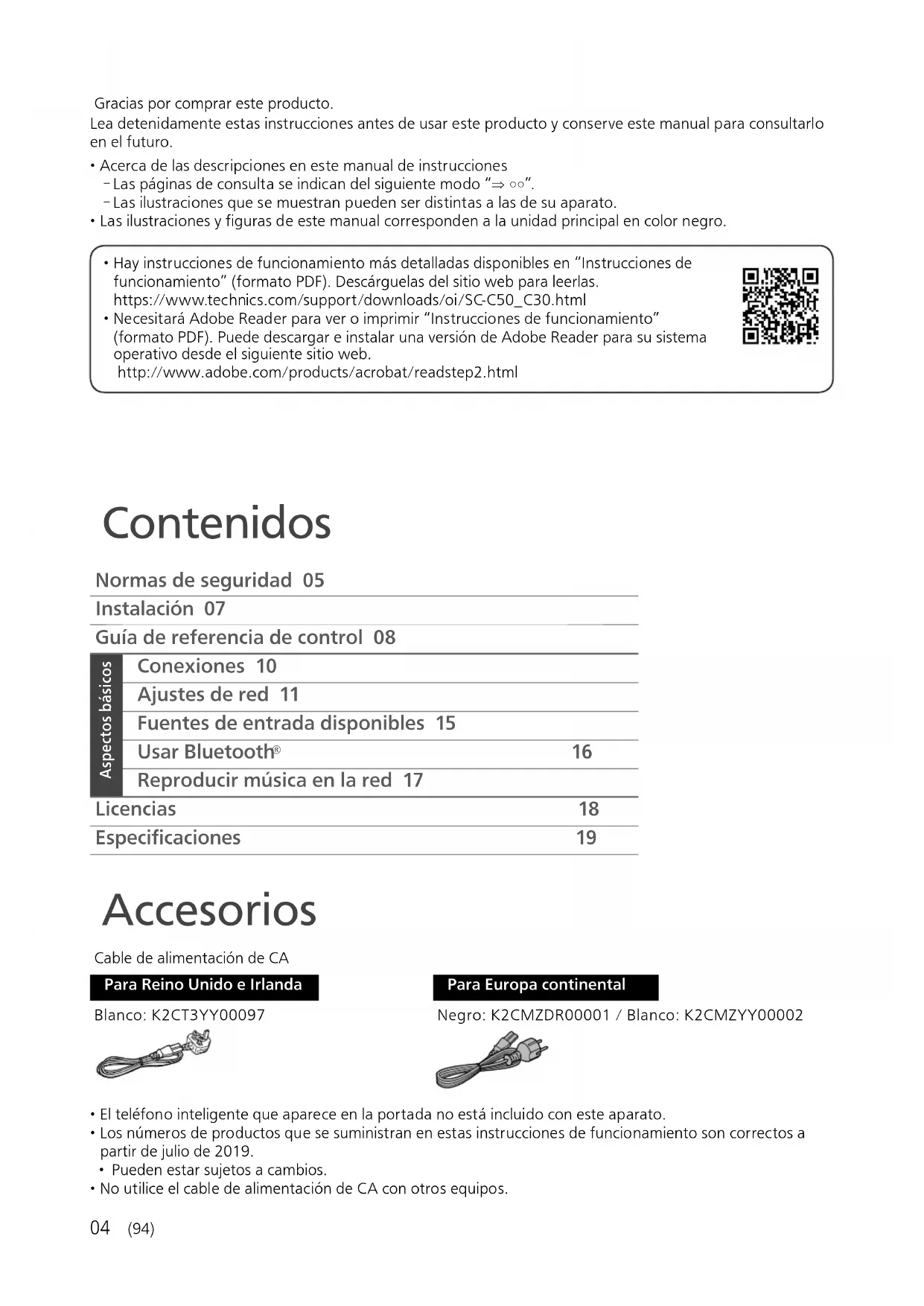 - Hay instrucciones de funcionamiento más detalladas disponibles en “Instrucciones de funcionamiento” (formato PDF). Descárguelas del sitio web para leerlas. https://www.technics.com/support/downloads/oi/SC-C50_C30.html