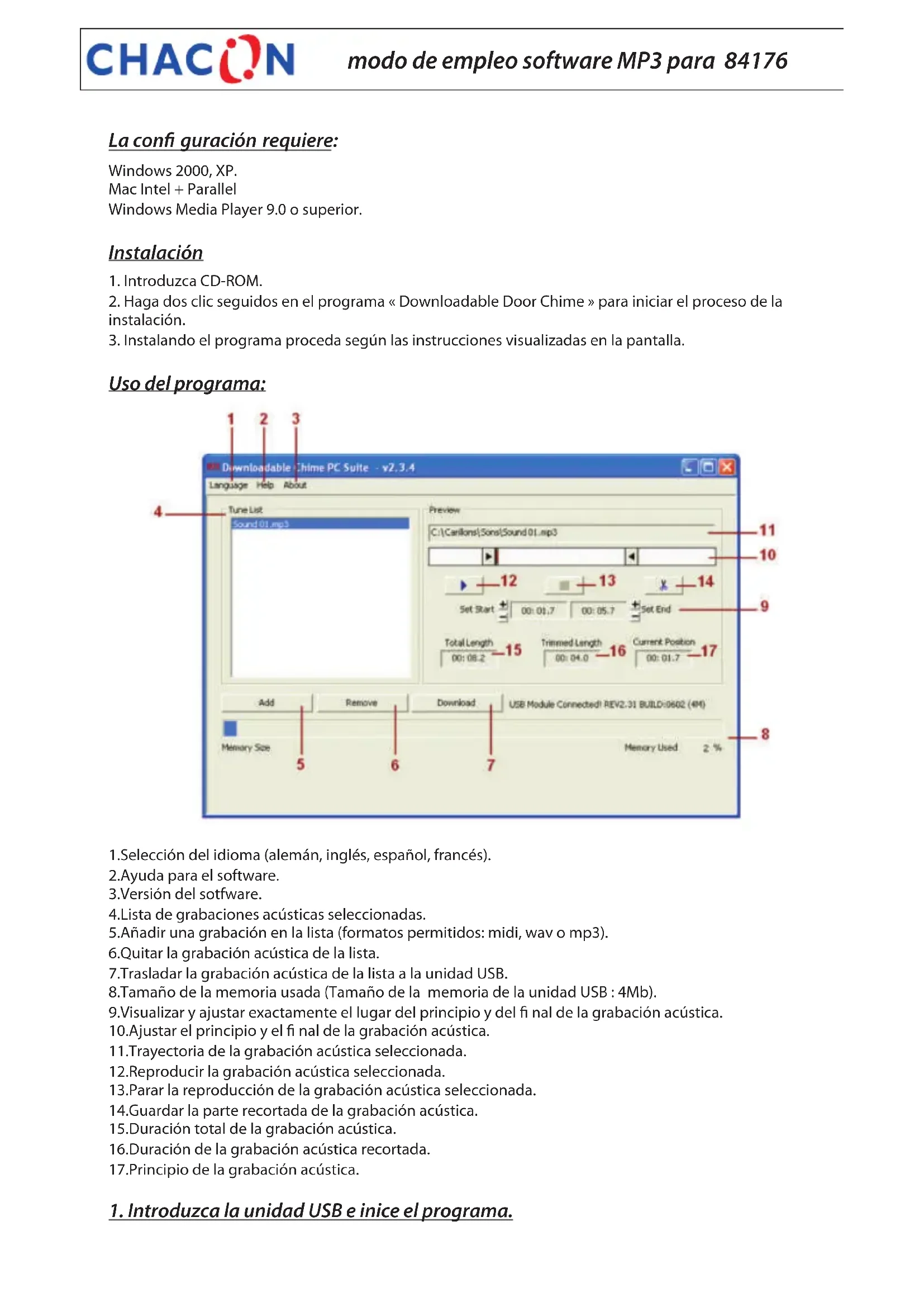 Uso del programa: 1.Selección del idioma (alemán, inglés, español, francés). 2.Ayuda para el software. 3.Versión del sotfware. 4.Lista de grabaciones acústicas seleccionadas. 5.Añadir una grabación en la lista (formatos permitidos: midi, wav o mp3). 6.Quitar la grabación acústica de la lista. 7.Trasladar la grabación acústica de la lista a la unidad USB. 8.Tamaño de la memoria usada (Tamaño de la memoria de la unidad USB : 4Mb). 9.Visualizar y ajustar exactamente el lugar del principio y del nal de la grabación acústica. 10.Ajustar el principio y el nal de la grabación acústica. 11.Trayectoria de la grabación acústica seleccionada. 12.Reproducir la grabación acústica seleccionada. 13.Parar la reproducción de la grabación acústica seleccionada. 14.Guardar la parte recortada de la grabación acústica. 15.Duración total de la grabación acústica. 16.Duración de la grabación acústica recortada. 17.Principio de la grabación acústica.