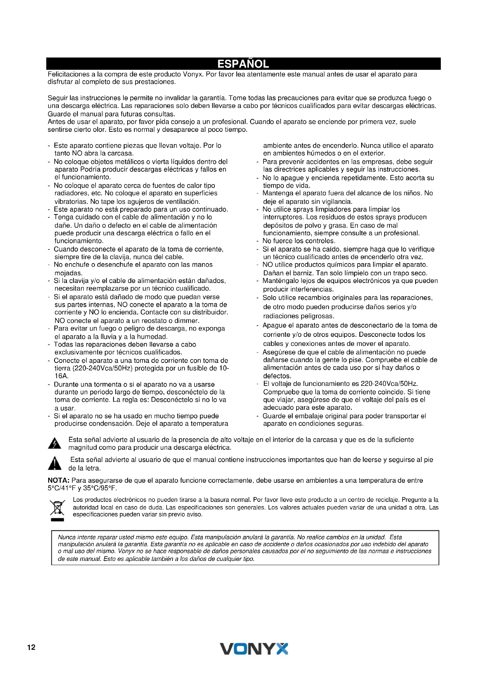 6,3-mm-Klinkenbuchse zum Anschluss eines Stereo Kopfhörers12 ESPAÑOL Felicitaciones a la compra de este producto Vonyx. Por favor lea atentamente este manual antes de usar el aparato para disfrutar al completo de sus prestaciones. Seguir las instrucciones le permite no invalidar la garantía. Tome todas las precauciones para evitar que se produzca fuego o una descarga eléctrica. Las reparaciones solo deben llevarse a cabo por técnicos cualificados para evitar descargas eléctricas. Guarde el manual para futuras consultas. Antes de usar el aparato, por favor pida consejo a un profesional. Cuando el aparato se enciende por primera vez, suele sentirse cierto olor. Esto es normal y desaparece al poco tiempo. - Este aparato contiene piezas que llevan voltaje. Por lo tanto NO abra la carcasa. - No coloque objetos metálicos o vierta líquidos dentro del aparato Podría producir descargas eléctricas y fallos en el funcionamiento. - No coloque el aparato cerca de fuentes de calor tipo radiadores, etc. No coloque el aparato en superficies vibratorias. No tape los agujeros de ventilación. - Este aparato no está preparado para un uso continuado. - Tenga cuidado con el cable de alimentación y no lo dañe. Un daño o defecto en el cable de alimentación puede producir una descarga eléctrica o fallo en el funcionamiento. - Cuando desconecte el aparato de la toma de corriente, siempre tire de la clavija, nunca del cable. - No enchufe o desenchufe el aparato con las manos mojadas. - Si la clavija y/o el cable de alimentación están dañados, necesitan reemplazarse por un técnico cualificado. - Si el aparato está dañado de modo que puedan verse sus partes internas, NO conecte el aparato a la toma de corriente y NO lo encienda. Contacte con su distribuidor. NO conecte el aparato a un reostato o dimmer. - Para evitar un fuego o peligro de descarga, no exponga el aparato a la lluvia y a la humedad. - Todas las reparaciones deben llevarse a cabo exclusivamente por técnicos cualificados. - Conecte el aparato a una toma de corriente con toma de tierra (220-240Vca/50Hz) protegida por un fusible de 10- 16A. - Durante una tormenta o si el aparato no va a usarse durante un periodo largo de tiempo, desconéctelo de la toma de corriente. La regla es: Desconéctelo si no lo va a usar. - Si el aparato no se ha usado en mucho tiempo puede producirse condensación. Deje el aparato a temperatura ambiente antes de encenderlo. Nunca utilice el aparato en ambientes húmedos o en el exterior. - Para prevenir accidentes en las empresas, debe seguir las directrices aplicables y seguir las instrucciones. - No lo apague y encienda repetidamente. Esto acorta su tiempo de vida. - Mantenga el aparato fuera del alcance de los niños. No deje el aparato sin vigilancia. - No utilice sprays limpiadores para limpiar los interruptores. Los residuos de estos sprays producen depósitos de polvo y grasa. En caso de mal funcionamiento, siempre consulte a un profesional. - No fuerce los controles. - Si el aparato se ha caído, siempre haga que lo verifique un técnico cualificado antes de encenderlo otra vez. - NO utilice productos químicos para limpiar el aparato. Dañan el barniz. Tan solo límpielo con un trapo seco. - Manténgalo lejos de equipos electrónicos ya que pueden producir interferencias. - Solo utilice recambios originales para las reparaciones, de otro modo pueden producirse daños serios y/o radiaciones peligrosas. - Apague el aparato antes de desconectarlo de la toma de corriente y/o de otros equipos. Desconecte todos los cables y conexiones antes de mover el aparato. - Asegúrese de que el cable de alimentación no puede dañarse cuando la gente lo pise. Compruebe el cable de alimentación antes de cada uso por si hay daños o defectos. - El voltaje de funcionamiento es 220-240Vca/50Hz. Compruebe que la toma de corriente coincide. Si tiene que viajar, asegúrese de que el voltaje del país es el adecuado para este aparato. - Guarde el embalaje original para poder transportar el aparato en condiciones seguras. Esta señal advierte al usuario de la presencia de alto voltaje en el interior de la carcasa y que es de la suficiente magnitud como para producir una descarga eléctrica. Esta señal advierte al usuario de que el manual contiene instrucciones importantes que han de leerse y seguirse al pie de la letra. NOTA: Para asegurarse de que el aparato funcione correctamente, debe usarse en ambientes a una temperatura de entre 5°C/41°F y 35°C/95°F. Los productos electrónicos no pueden tirarse a la basura normal. Por favor lleve este producto a un centro de reciclaje. Pregunte a la autoridad local en caso de duda. Las especificaciones son generales. Los valores actuales pueden variar de una unidad a otra. Las especificaciones pueden variar sin previo aviso.