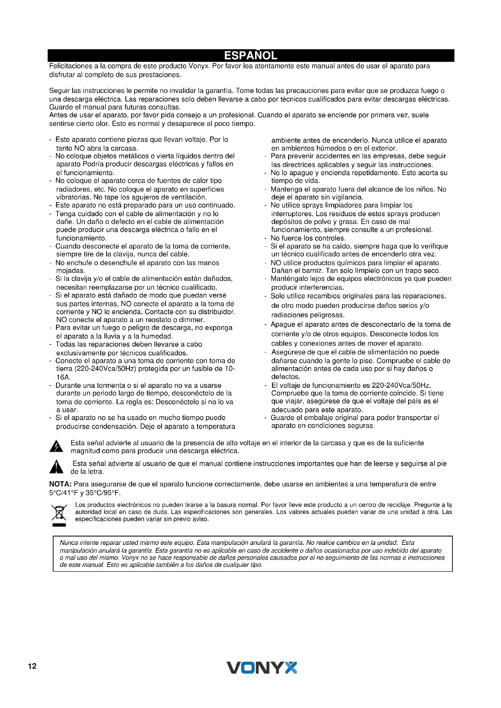 Drücken Sie die Taste kurz, um den vorherigen Titel auszuwählen, drücken Sie lang, um die Lautstärke zu verringern.12 ESPAÑOL Felicitaciones a la compra de este producto Vonyx. Por favor lea atentamente este manual antes de usar el aparato para disfrutar al completo de sus prestaciones. Seguir las instrucciones le permite no invalidar la garantía. Tome todas las precauciones para evitar que se produzca fuego o una descarga eléctrica. Las reparaciones solo deben llevarse a cabo por técnicos cualificados para evitar descargas eléctricas. Guarde el manual para futuras consultas. Antes de usar el aparato, por favor pida consejo a un profesional. Cuando el aparato se enciende por primera vez, suele sentirse cierto olor. Esto es normal y desaparece al poco tiempo. - Este aparato contiene piezas que llevan voltaje. Por lo tanto NO abra la carcasa. - No coloque objetos metálicos o vierta líquidos dentro del aparato Podría producir descargas eléctricas y fallos en el funcionamiento. - No coloque el aparato cerca de fuentes de calor tipo radiadores, etc. No coloque el aparato en superficies vibratorias. No tape los agujeros de ventilación. - Este aparato no está preparado para un uso continuado. - Tenga cuidado con el cable de alimentación y no lo dañe. Un daño o defecto en el cable de alimentación puede producir una descarga eléctrica o fallo en el funcionamiento. - Cuando desconecte el aparato de la toma de corriente, siempre tire de la clavija, nunca del cable. - No enchufe o desenchufe el aparato con las manos mojadas. - Si la clavija y/o el cable de alimentación están dañados, necesitan reemplazarse por un técnico cualificado. - Si el aparato está dañado de modo que puedan verse sus partes internas, NO conecte el aparato a la toma de corriente y NO lo encienda. Contacte con su distribuidor. NO conecte el aparato a un reostato o dimmer. - Para evitar un fuego o peligro de descarga, no exponga el aparato a la lluvia y a la humedad. - Todas las reparaciones deben llevarse a cabo exclusivamente por técnicos cualificados. - Conecte el aparato a una toma de corriente con toma de tierra (220-240Vca/50Hz) protegida por un fusible de 10- 16A. - Durante una tormenta o si el aparato no va a usarse durante un periodo largo de tiempo, desconéctelo de la toma de corriente. La regla es: Desconéctelo si no lo va a usar. - Si el aparato no se ha usado en mucho tiempo puede producirse condensación. Deje el aparato a temperatura ambiente antes de encenderlo. Nunca utilice el aparato en ambientes húmedos o en el exterior. - Para prevenir accidentes en las empresas, debe seguir las directrices aplicables y seguir las instrucciones. - No lo apague y encienda repetidamente. Esto acorta su tiempo de vida. - Mantenga el aparato fuera del alcance de los niños. No deje el aparato sin vigilancia. - No utilice sprays limpiadores para limpiar los interruptores. Los residuos de estos sprays producen depósitos de polvo y grasa. En caso de mal funcionamiento, siempre consulte a un profesional. - No fuerce los controles. - Si el aparato se ha caído, siempre haga que lo verifique un técnico cualificado antes de encenderlo otra vez. - NO utilice productos químicos para limpiar el aparato. Dañan el barniz. Tan solo límpielo con un trapo seco. - Manténgalo lejos de equipos electrónicos ya que pueden producir interferencias. - Solo utilice recambios originales para las reparaciones, de otro modo pueden producirse daños serios y/o radiaciones peligrosas. - Apague el aparato antes de desconectarlo de la toma de corriente y/o de otros equipos. Desconecte todos los cables y conexiones antes de mover el aparato. - Asegúrese de que el cable de alimentación no puede dañarse cuando la gente lo pise. Compruebe el cable de alimentación antes de cada uso por si hay daños o defectos. - El voltaje de funcionamiento es 220-240Vca/50Hz. Compruebe que la toma de corriente coincide. Si tiene que viajar, asegúrese de que el voltaje del país es el adecuado para este aparato. - Guarde el embalaje original para poder transportar el aparato en condiciones seguras. Esta señal advierte al usuario de la presencia de alto voltaje en el interior de la carcasa y que es de la suficiente magnitud como para producir una descarga eléctrica. Esta señal advierte al usuario de que el manual contiene instrucciones importantes que han de leerse y seguirse al pie de la letra. NOTA: Para asegurarse de que el aparato funcione correctamente, debe usarse en ambientes a una temperatura de entre 5°C/41°F y 35°C/95°F. Los productos electrónicos no pueden tirarse a la basura normal. Por favor lleve este producto a un centro de reciclaje. Pregunte a la autoridad local en caso de duda. Las especificaciones son generales. Los valores actuales pueden variar de una unidad a otra. Las especificaciones pueden variar sin previo aviso.