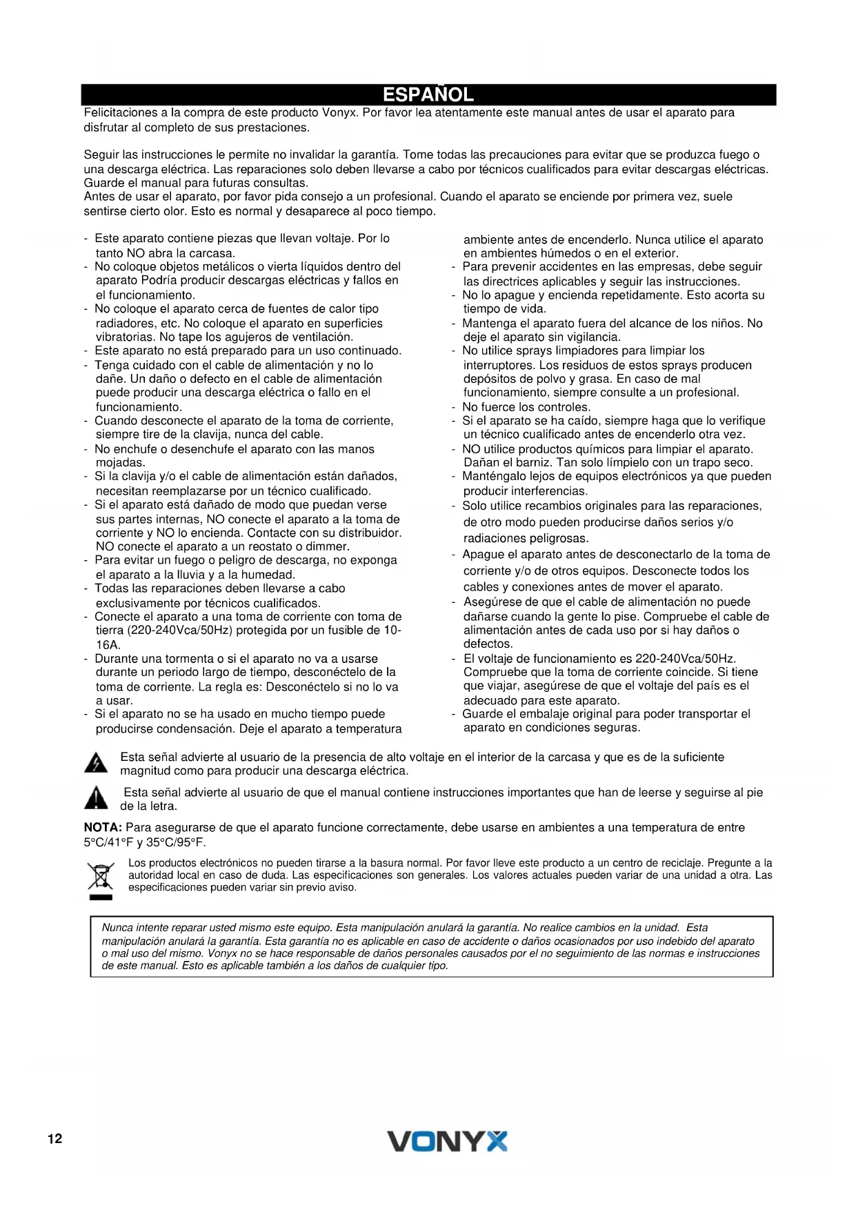 Drücken Sie die Taste kurz, um den vorherigen Titel auszuwählen, drücken Sie lang, um die Lautstärke zu verringern.12 ESPAÑOL Felicitaciones a la compra de este producto Vonyx. Por favor lea atentamente este manual antes de usar el aparato para disfrutar al completo de sus prestaciones. Seguir las instrucciones le permite no invalidar la garantía. Tome todas las precauciones para evitar que se produzca fuego o una descarga eléctrica. Las reparaciones solo deben llevarse a cabo por técnicos cualificados para evitar descargas eléctricas. Guarde el manual para futuras consultas. Antes de usar el aparato, por favor pida consejo a un profesional. Cuando el aparato se enciende por primera vez, suele sentirse cierto olor. Esto es normal y desaparece al poco tiempo. - Este aparato contiene piezas que llevan voltaje. Por lo tanto NO abra la carcasa. - No coloque objetos metálicos o vierta líquidos dentro del aparato Podría producir descargas eléctricas y fallos en el funcionamiento. - No coloque el aparato cerca de fuentes de calor tipo radiadores, etc. No coloque el aparato en superficies vibratorias. No tape los agujeros de ventilación. - Este aparato no está preparado para un uso continuado. - Tenga cuidado con el cable de alimentación y no lo dañe. Un daño o defecto en el cable de alimentación puede producir una descarga eléctrica o fallo en el funcionamiento. - Cuando desconecte el aparato de la toma de corriente, siempre tire de la clavija, nunca del cable. - No enchufe o desenchufe el aparato con las manos mojadas. - Si la clavija y/o el cable de alimentación están dañados, necesitan reemplazarse por un técnico cualificado. - Si el aparato está dañado de modo que puedan verse sus partes internas, NO conecte el aparato a la toma de corriente y NO lo encienda. Contacte con su distribuidor. NO conecte el aparato a un reostato o dimmer. - Para evitar un fuego o peligro de descarga, no exponga el aparato a la lluvia y a la humedad. - Todas las reparaciones deben llevarse a cabo exclusivamente por técnicos cualificados. - Conecte el aparato a una toma de corriente con toma de tierra (220-240Vca/50Hz) protegida por un fusible de 10- 16A. - Durante una tormenta o si el aparato no va a usarse durante un periodo largo de tiempo, desconéctelo de la toma de corriente. La regla es: Desconéctelo si no lo va a usar. - Si el aparato no se ha usado en mucho tiempo puede producirse condensación. Deje el aparato a temperatura ambiente antes de encenderlo. Nunca utilice el aparato en ambientes húmedos o en el exterior. - Para prevenir accidentes en las empresas, debe seguir las directrices aplicables y seguir las instrucciones. - No lo apague y encienda repetidamente. Esto acorta su tiempo de vida. - Mantenga el aparato fuera del alcance de los niños. No deje el aparato sin vigilancia. - No utilice sprays limpiadores para limpiar los interruptores. Los residuos de estos sprays producen depósitos de polvo y grasa. En caso de mal funcionamiento, siempre consulte a un profesional. - No fuerce los controles. - Si el aparato se ha caído, siempre haga que lo verifique un técnico cualificado antes de encenderlo otra vez. - NO utilice productos químicos para limpiar el aparato. Dañan el barniz. Tan solo límpielo con un trapo seco. - Manténgalo lejos de equipos electrónicos ya que pueden producir interferencias. - Solo utilice recambios originales para las reparaciones, de otro modo pueden producirse daños serios y/o radiaciones peligrosas. - Apague el aparato antes de desconectarlo de la toma de corriente y/o de otros equipos. Desconecte todos los cables y conexiones antes de mover el aparato. - Asegúrese de que el cable de alimentación no puede dañarse cuando la gente lo pise. Compruebe el cable de alimentación antes de cada uso por si hay daños o defectos. - El voltaje de funcionamiento es 220-240Vca/50Hz. Compruebe que la toma de corriente coincide. Si tiene que viajar, asegúrese de que el voltaje del país es el adecuado para este aparato. - Guarde el embalaje original para poder transportar el aparato en condiciones seguras. Esta señal advierte al usuario de la presencia de alto voltaje en el interior de la carcasa y que es de la suficiente magnitud como para producir una descarga eléctrica. Esta señal advierte al usuario de que el manual contiene instrucciones importantes que han de leerse y seguirse al pie de la letra. NOTA: Para asegurarse de que el aparato funcione correctamente, debe usarse en ambientes a una temperatura de entre 5°C/41°F y 35°C/95°F. Los productos electrónicos no pueden tirarse a la basura normal. Por favor lleve este producto a un centro de reciclaje. Pregunte a la autoridad local en caso de duda. Las especificaciones son generales. Los valores actuales pueden variar de una unidad a otra. Las especificaciones pueden variar sin previo aviso.