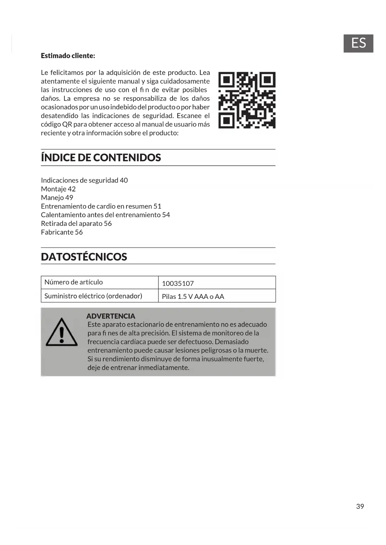 Indicaciones de seguridad 40 Montaje 42 Manejo 49 Entrenamiento de cardio en resumen 51 Calentamiento antes del entrenamiento 54 Retirada del aparato 56 Fabricante 56