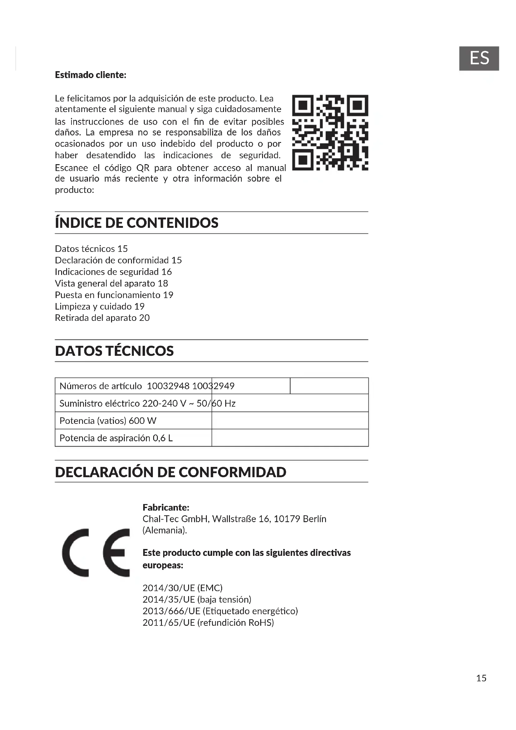 Fabricante: Chal-Tec GmbH, Wallstraße 16, 10179 Berlín (Alemania). Este producto cumple con las siguientes direcvas europeas: 2014/30/UE (EMC) 2014/35/UE (baja tensión) 2013/666/UE (Equetado energéco) 2011/65/UE (refundición RoHS) Esmado cliente: Le felicitamos por la adquisición de este producto. Lea atentamente el siguiente manual y siga cuidadosamente las instrucciones de uso con el n de evitar posibles daños. La empresa no se responsabiliza de los daños ocasionados por un uso indebido del producto o por haber desatendido las indicaciones de seguridad. Escanee el código QR para obtener acceso al manual de usuario más reciente y otra información sobre el producto: