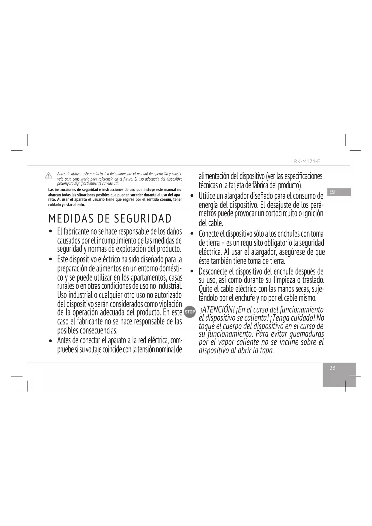 GBR FRA DEU ITA ESP EST SVK RUS POL RUS UKR KAZ Antes de utilizar este producto, lea detenidamente el manual de operación y consér- velo para consultarlo para referencia en el futuro. El uso adecuado del dispositivo prolongará signicativamente su vida útil. Las instrucciones de seguridad e instrucciones de uso que incluye este manual no abarcan todas las situaciones posibles que pueden suceder durante el uso del apa- rato. Al usar el aparato el usuario tiene que regirse por el sentido común, tener cuidado y estar atento.