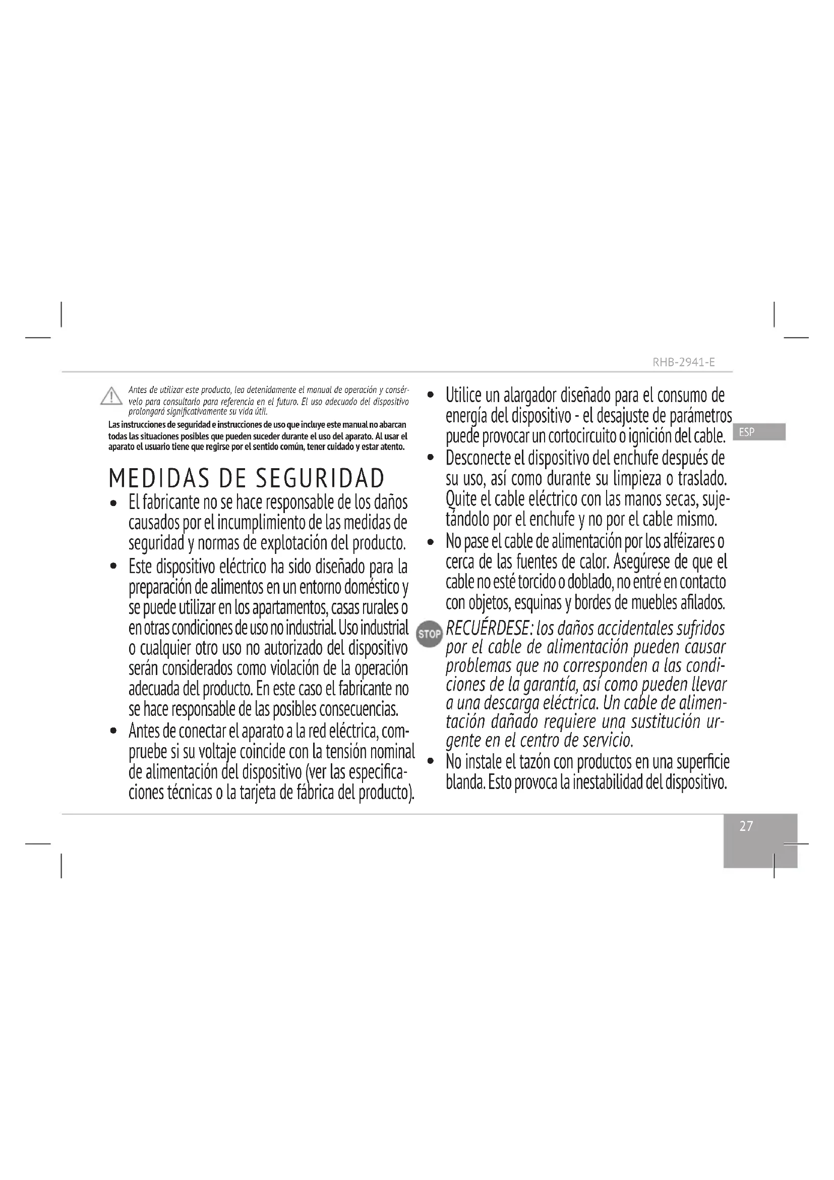 Problema Posible causa Solución El aparato no se enciendeEl aparato no está conec-tado a la red eléctricaConecte el aparato a la red eléc-trica.Salida gobernador defec-tuosaEnchufe el aparato en una toma de trabajoAl cortar los productos se siente una fuerte vi-bración de la aplicaciónLos productos son dema-siado grandesCortar los productos más pequeñosEl motor se detuvo du-rante la operaciónProtección contra sobre-calentamiento y sobre-calentamientoSiga las instrucciones de la sección “Sistema de protección contra so-brecarga y sobrecalentamiento” Durante el funcionami-ento del aparato había un olor extrañoEl aparato se sobrecali-enta durante la operaciónReducir el tiempo de funcionami-ento continuo, aumentar los inter-valos entreDurante el funcionami-ento del aparato había un olor extrañoAlgunas partes del apara-to se aplican con una capa protectoraEl olor desaparecerá después de unos pocos comienzos Si el problema persiste, póngase en contacto con un centro de servicio autorizado. Utilización ecológica no dañosa (utilización eléctrica y maquinaria electrónica) La eliminación del embalaje, del manual de utilización, así como el propio instrumento debe ser llevada a cabo de conformidad con los programas locales de reciclaje. Muestre preocupación por el medio ambiente: no deseche este tipo de artículos con la basura doméstica normal.RHB-2941-E
