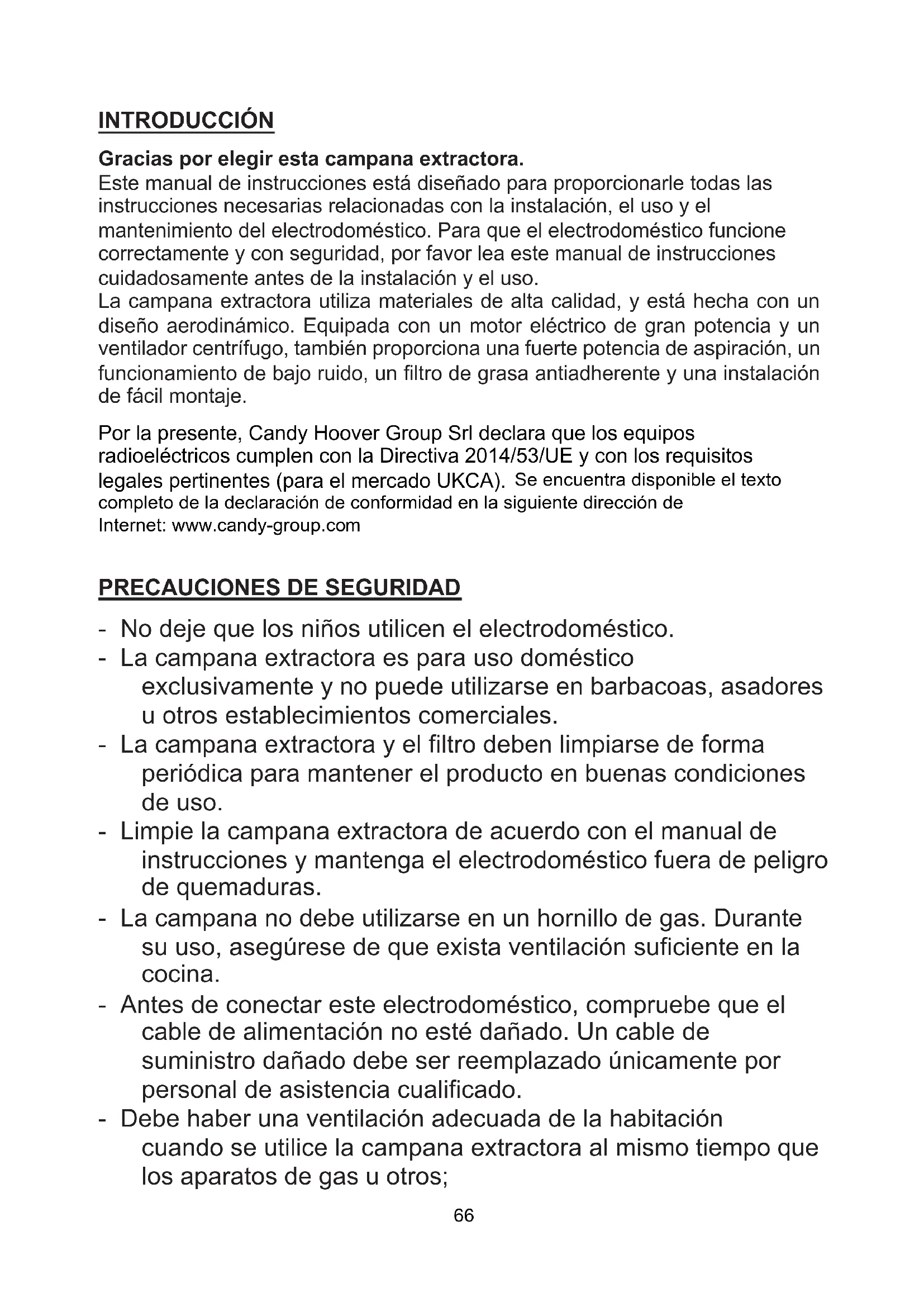 INTRODUCCIÓN Gracias por elegir esta campana extractora. Este manual de instrucciones está diseñado para proporcionarle todas las instrucciones necesarias relacionadas con la instalación, el uso y el mantenimiento del electrodoméstico. Para que el electrodoméstico funcione correctamente y con seguridad, por favor lea este manual de instrucciones cuidadosamente antes de la instalación y el uso. La campana extractora utiliza materiales de alta calidad, y está hecha con un diseño aerodinámico. Equipada con un motor eléctrico de gran potencia y un ventilador centrífugo, también proporciona una fuerte potencia de aspiración, un funcionamiento de bajo ruido, un filtro de grasa antiadherente y una instalación de fácil montaje. Por la presente, Candy Hoover Group Srl declara que los equipos radioeléctricos cumplen con la Directiva 2014/53/UE y con los requisitos legales pertinentes (para el mercado UKCA). Se encuentra disponible el texto Internet: www.candy-group.com