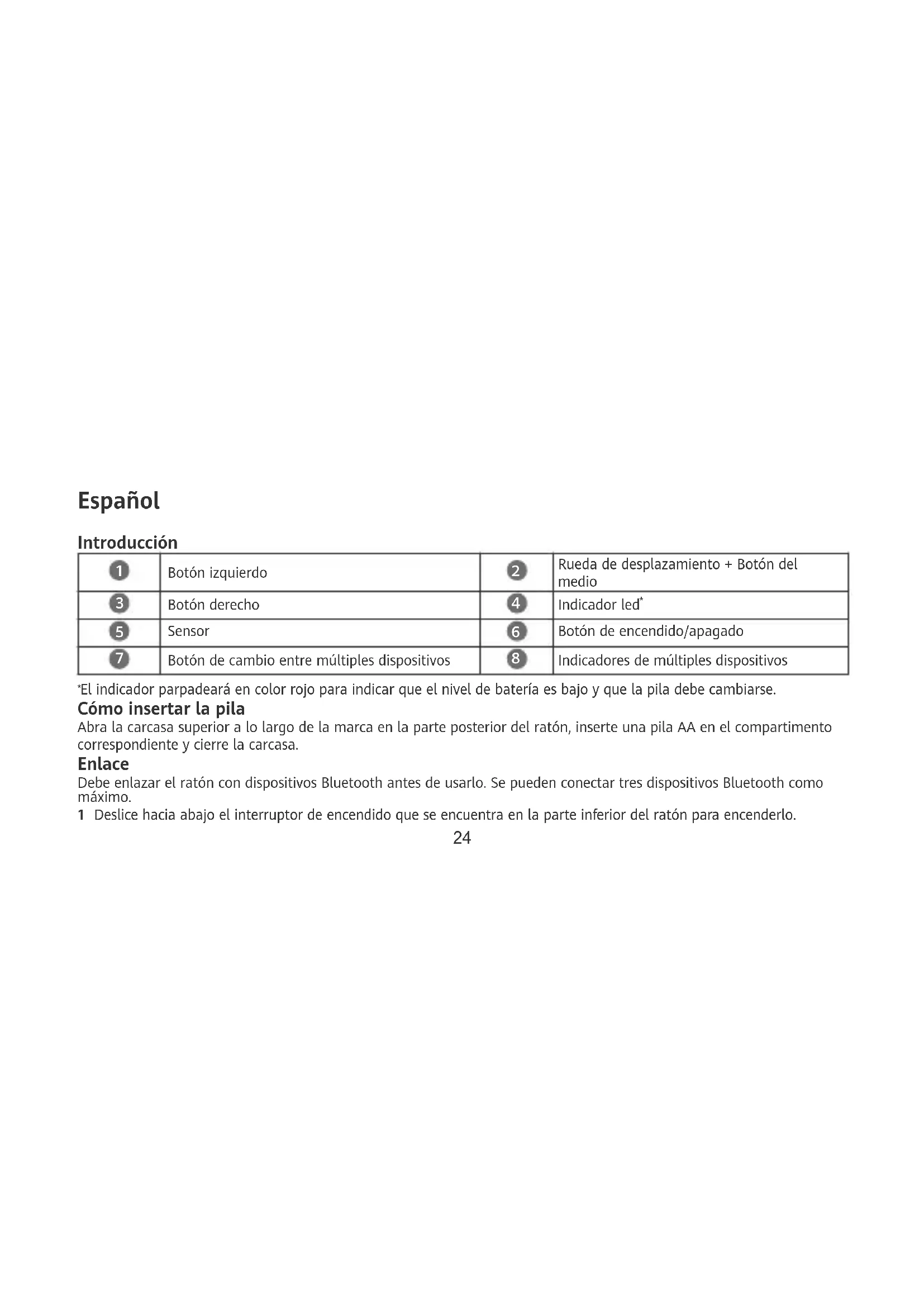El indicador parpadeará en color rojo para indicar que el nivel de batería es bajo y que la pila debe cambiarse. Cómo insertar la pila Abra la carcasa superior a lo largo de la marca en la parte posterior del ratón, inserte una pila AA en el compartimento correspondiente y cierre la carcasa. Enlace Debe enlazar el ratón con dispositivos Bluetooth antes de usarlo. Se pueden conectar tres dispositivos Bluetooth como máximo. 1 Deslice hacia abajo el interruptor de encendido que se encuentra en la parte inferior del ratón para encenderlo. 242 Mantenga pulsado el botón de cambio entre múltiples dispositivos durante 3 segundos. Un indicador de múltiples dispositivos parpadeará rápidamente y el ratón estará listo para enlazar. (Cuando enlaza el ratón por primera vez, no es necesario mantener pulsado el botón de cambio entre múltiples dispositivos. Una vez encendido el ratón, un indicador de múltiples dispositivos parpadeará rápidamente y el ratón estará listo para enlazar de forma automática). 3 Inicie el enlace en un dispositivo Bluetooth, seleccione el nombre del ratón y siga las instrucciones en pantalla para terminar el enlace. 4 Pulse el botón de cambio entre múltiples dispositivos para que el indicador de múltiples dispositivos correspondiente se encienda. A continuación, mantenga pulsado el botón de cambio entre múltiples dispositivos durante 3 segundos y realice los pasos anteriores para enlazarlo con otros dispositivos Bluetooth. El ratón solo admite dispositivos con Windows 10, Windows 8.1, macOS 10.10, iOS 13.1, HarmonyOS 2, Android 5.0 o versiones posteriores, o Linux. Uso Pulse el botón de cambio entre múltiples dispositivos para alternar entre múltiples dispositivos Bluetooth. Información de seguridad