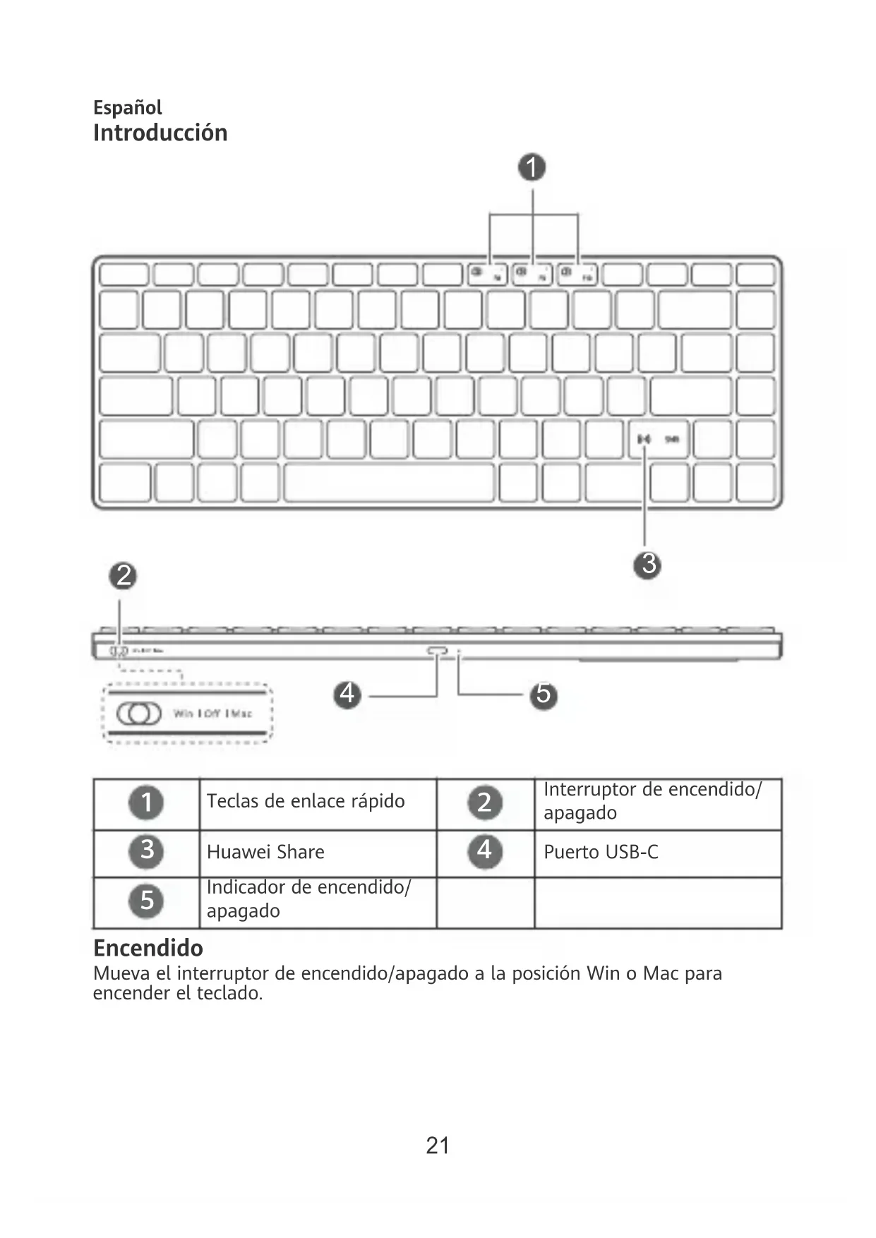 Indicador de encendido/ apagado Encendido Mueva el interruptor de encendido/apagado a la posición Win o Mac para encender el teclado. 21Si el teclado está conectado a un dispositivo Windows, EMUI o Android, se recomienda mover el interruptor de encendido/apagado a la posición Win. Si el teclado está conectado a un dispositivo iOS o macOS, se recomienda mover el interruptor de encendido/apagado a la posición Mac. De lo contrario, es posible que haya problemas de compatibilidad con algunas teclas. Conexión 1 Coloque el teclado cerca de un dispositivo y mantenga pulsada cualquiera de las teclas de enlace rápido durante más de tres segundos para iniciar el enlace. (Una vez que el teclado se haya encendido por primera vez, el enlace se iniciará automáticamente, sin necesidad de que mantenga pulsada una tecla de enlace rápido). 2 A continuación, aparecerá un aviso en la pantalla del dispositivo. Siga las instrucciones que aparecen en la pantalla para nalizar el enlace.