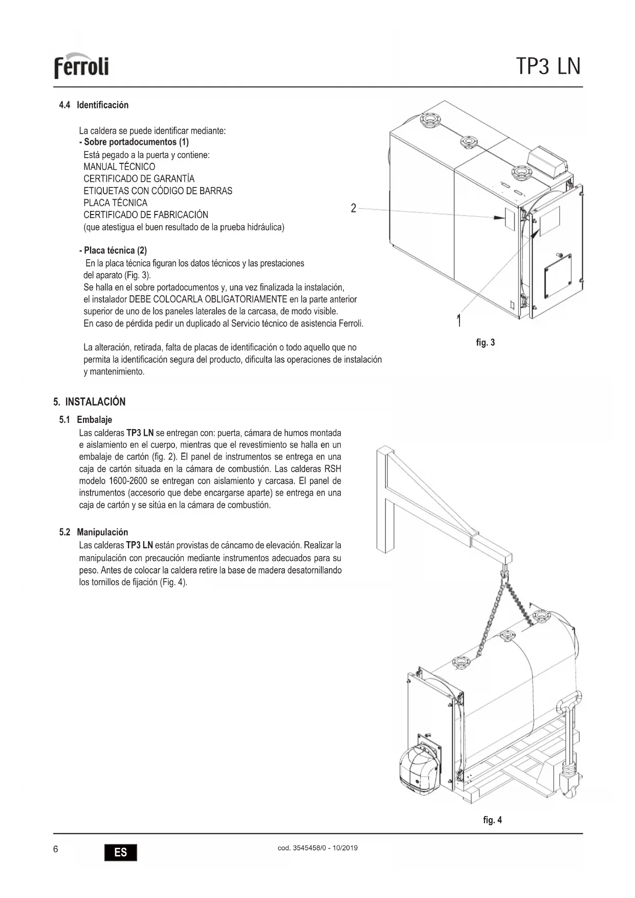 Las calderas TP3 LN se entregan con: puerta, cámara de humos montada e aislamiento en el cuerpo, mientras que el revestimiento se halla en un embalaje de cartón (fig. 2). El panel de instrumentos se entrega en una caja de cartón situada en la cámara de combustión. Las calderas RSH modelo 1600-2600 se entregan con aislamiento y carcasa. El panel de instrumentos (accesorio que debe encargarse aparte) se entrega en una caja de cartón y se sitúa en la cámara de combustión.