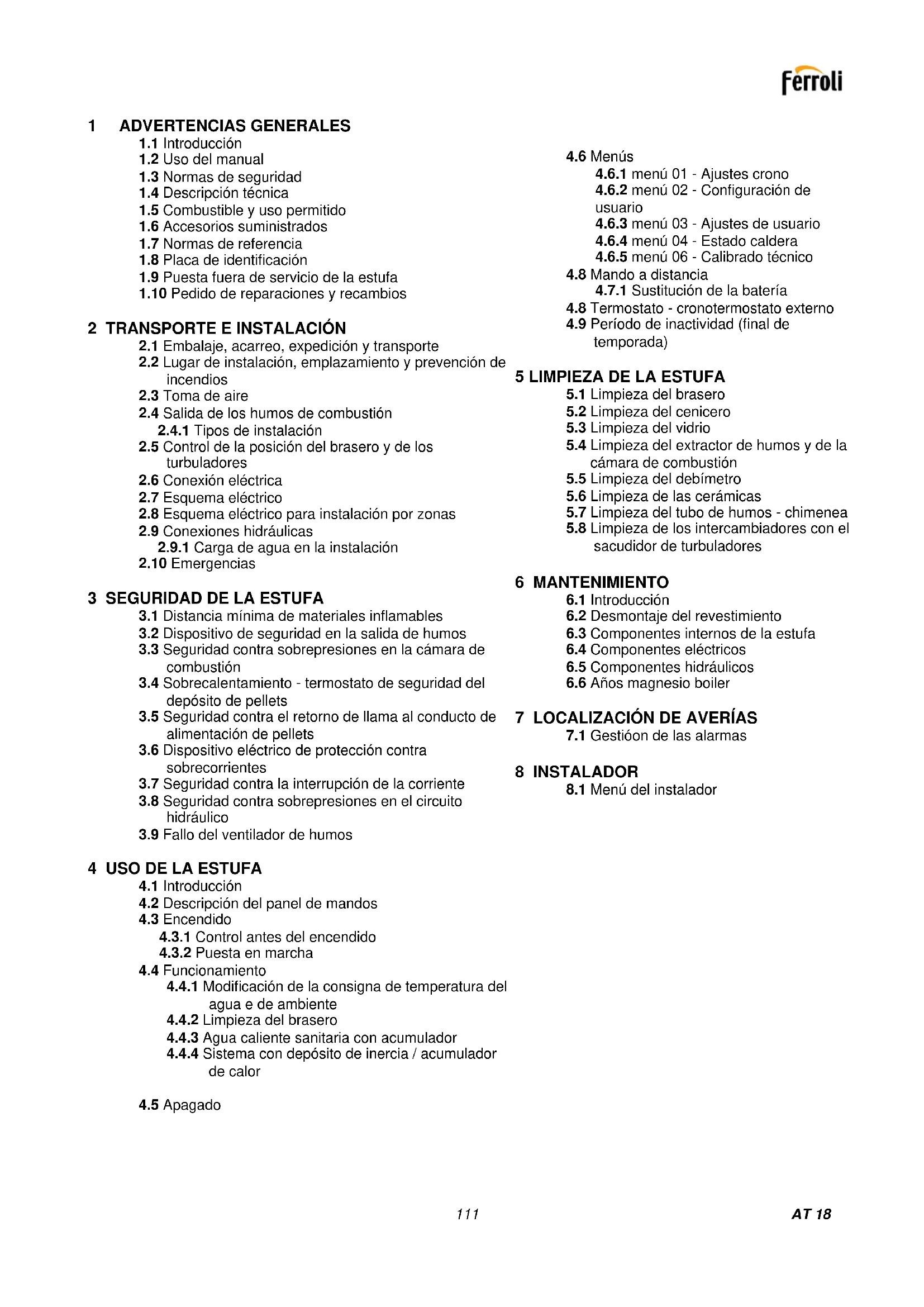 - Leer este manual antes de realizar operaciones de instalación, uso y mantenimiento de la estufa. - Hacer realizar la instalación, la conexión eléctrica, la prueba y el mantenimiento por un técnico autorizado. - Conectar la estufa a una chimenea según normas a través de un terminal inspeccionable. La conexión de varios aparatos a una misma chimenea debe estar autorizada por las normas locales y por el organismo de control de este tipo de sistemas. - Conectar la estufa a la aspiración mediante un tubo o toma de aire desde el exterior. - Conectar la estufa a una toma de corriente homologada de 230 V - 50 Hz. - En el modelo TERMO, conectar el equipo a la instalación de calefacción. No utilizarlo en ningún caso sin la conexión hidráulica y sin cargar agua en la cámara térmica. - Controlar que la instalación eléctrica y las tomas de corriente tengan capacidad para soportar la absorción máxima del equipo, indicada en la placa y en este manual. - Antes de hacer cualquier operación de mantenimiento, desconectar la estufa de la corriente eléctrica y dejar que se enfríe. - No utilizar líquidos o sustancias inflamables para encender la estufa o reavivar la llama: con la estufa en marcha, los pellets se encienden automáticamente. - Alimentar la estufa exclusivamente con pellets de madera que tengan las características descritas en este manual. - No utilizar la estufa como incinerador de residuos. - No cerrar en ningún caso las entradas de aire comburente ni las salidas de humos. - No manipular sustancias fácilmente inflamables o explosivas cerca de la estufa encendida. - No quitar la rejilla de protección del depósito de pellets. - No utilizar la estufa con la puerta de la cámara de combustión abierta o con el vidrio rajado o roto. - Durante el funcionamiento, el intenso calor generado por la combustión de los pellets calienta las superficies externas de la estufa, en particular la puerta de la cámara, la manija y el tubo de salida de humos. Evitar el contacto con dichas partes sin una protección adecuada. - Mantener a una distancia prudencial los objetos inflamables o que no resistan al calor. - Limpiar correctamente el brasero a cada encendido o recarga de pellets. - Evitar la formación de humo y de material inquemado durante el encendido y el funcionamiento. Si se acumula mucho pellet sin quemar en el brasero, quitarlo manualmente antes del próximo encendido. - Hacer limpiar el conducto y los deflectores de humo, dentro de la cámara de combustión, por un técnico autorizado. - Advertir a los niños y huéspedes de los peligros anteriormente descritos. - El dispositivo puede ser utilizado por niños menores de 8 años de edad, y por personas con capacidades físicas, sensoriales o mentales reducidas, o falta de experiencia o conocimiento, siempre bajo vigilancia o después de sus de haber recibido instrucciones 'uso seguro de y la comprensión de los peligros inherentes a ella. - En caso de anomalías de funcionamiento, no reencender la estufa hasta que se haya resuelto la causa del problema. - Las modificaciones de la estufa o el uso de recambios no originales sin la debida autorización pueden poner al usuario en peligro, ante lo cual el fabricante queda exento de responsabilidad civil o penal. - Utilizar solo recambios originales indicados por el fabricante. El fabricante no asume ninguna responsabilidad por inconvenientes, roturas o accidentes debidos a la inobservancia de las indicaciones dadas en el presente manual.113 AT 18