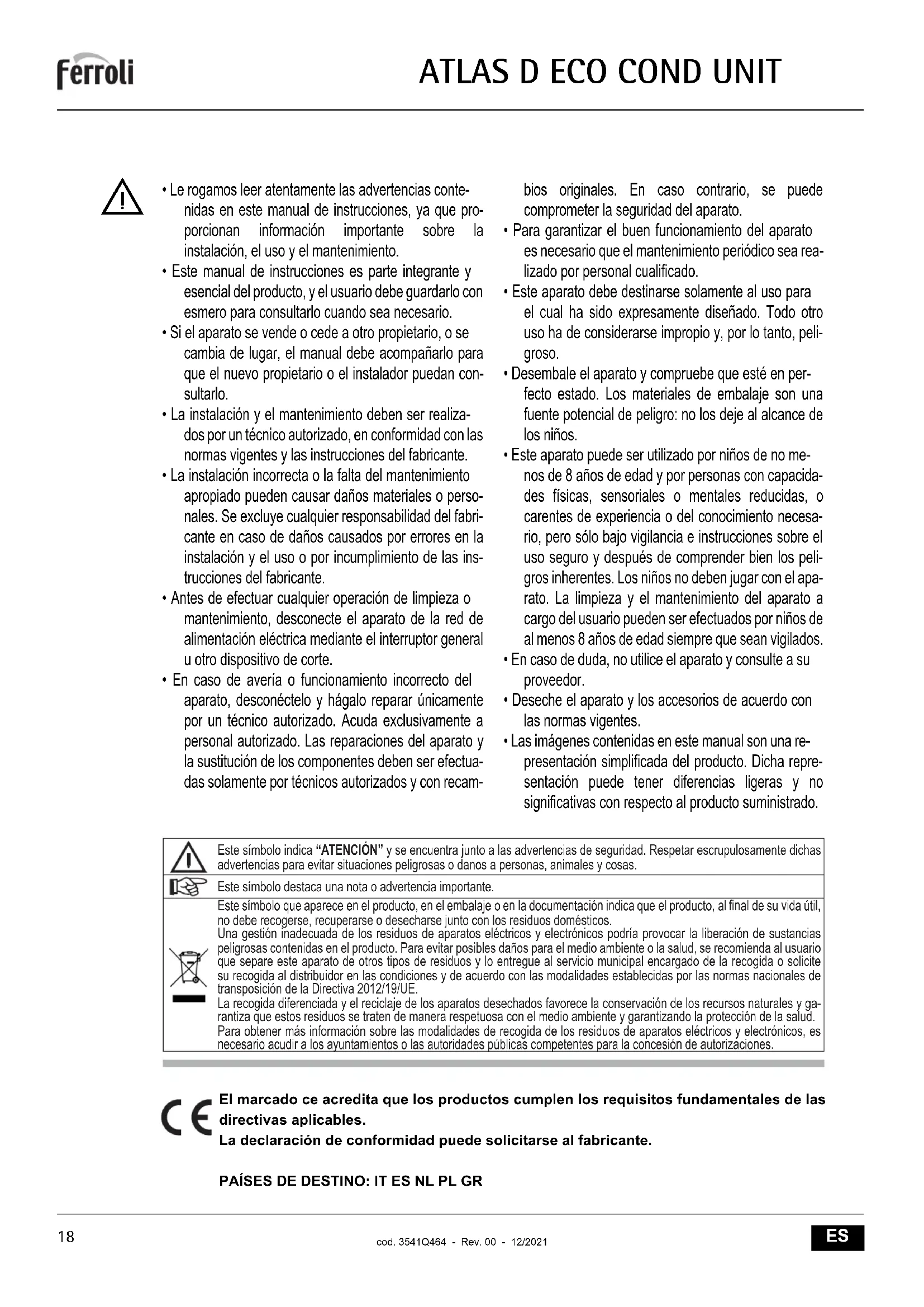 - Las imágenes contenidas en este manual son una re- presentación simplificada del producto. Dicha repre- sentación puede tener diferencias ligeras y no significativas con respecto al producto suministrado.ATLAS D ECO COND UNIT