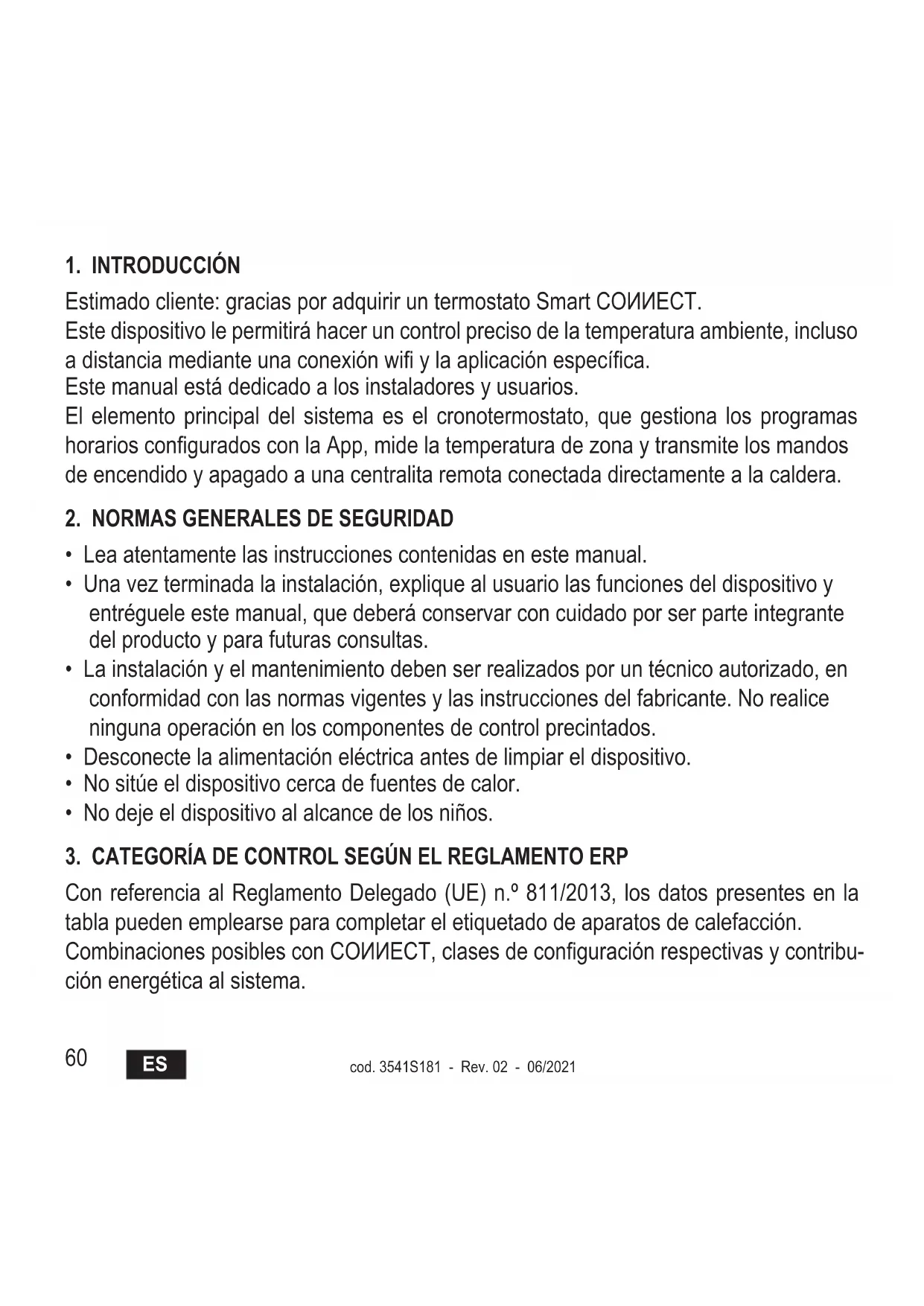 Estimado cliente: gracias por adquirir un termostato Smart COИИECT. Este dispositivo le permitirá hacer un control preciso de la temperatura ambiente, incluso a distancia mediante una conexión wi y la aplicación especíca. Este manual está dedicado a los instaladores y usuarios. El elemento principal del sistema es el cronotermostato, que gestiona los programas horarios congurados con la App, mide la temperatura de zona y transmite los mandos de encendido y apagado a una centralita remota conectada directamente a la caldera.